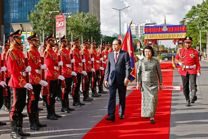 Sau khi Chủ tịch Quốc hội Trần Thanh Mẫn và Chủ tịch Quốc hội Samdech Khuon Sudary vào vị trí danh dự, Quân nhạc cử quốc thiều Việt Nam và Campuchia. Tiếp đó, hai Chủ tịch Quốc hội cùng duyệt Đội danh dự Quân đội Hoàng gia Campuchia.