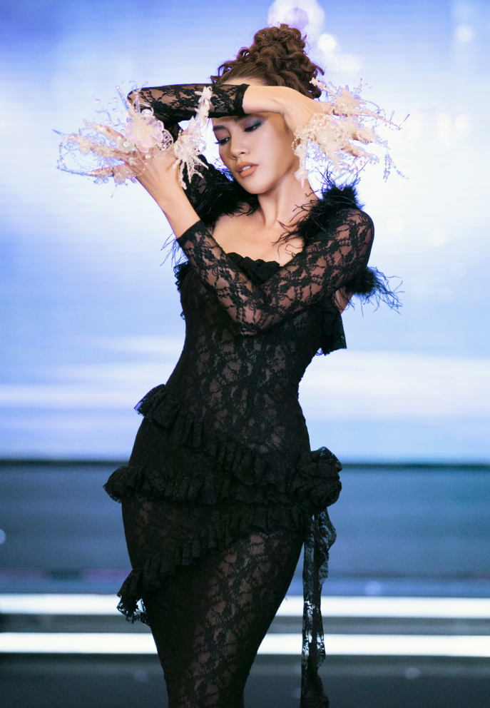 Lê Hoàng Phương đảm nhiệm vị trí mở màn cho bộ sưu tập LANFUNSY của NTK Phụng Mỹ, thuộc khuôn khổ một sự kiện thời trang tổ chức tại TP.HCM. Trang phục của cô được chăm chút theo phong cách cổ điển nhờ kết hợp nhiều lớp vải ren đen, tạo cảm giác ma mị, bí ẩn.