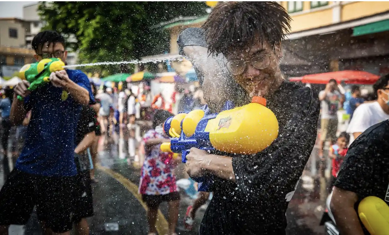 Theo tờ The Guardian và Bangkok Post, tại đường Silom ở thủ đô Bangkok, nhiều người bán hàng rong mặc áo hoa đứng bán các khẩu súng phun nước sặc sỡ trong khi các cửa hàng bày ra những thùng nước đá để du khách và người dân địa phương "nạp lại đạn".