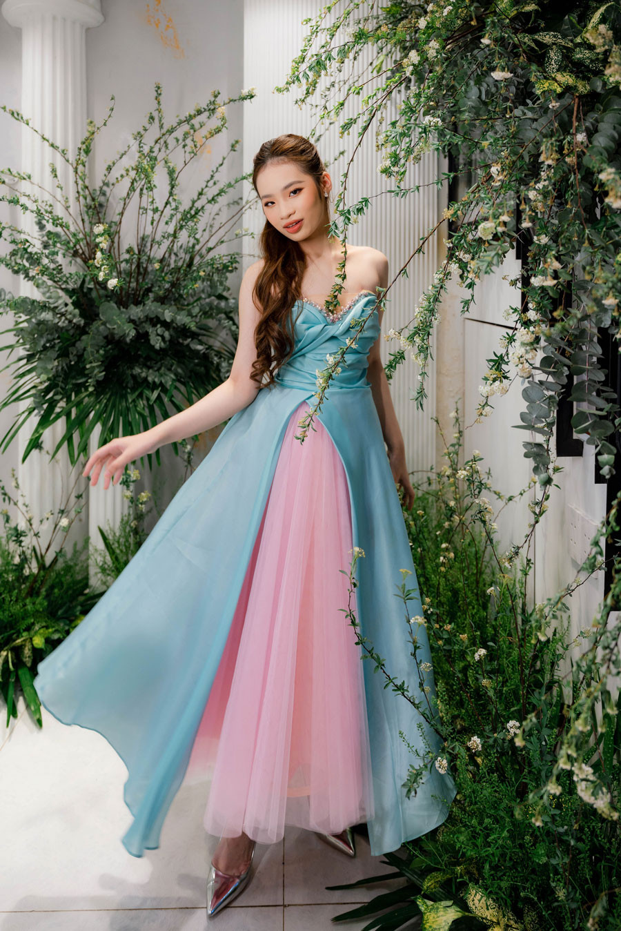 Ngọc Châu diện đầm ngắn dáng xòe họa tiết hoa xuân. Cô được khen tràn đầy sức sống với thiết kế rực rỡ này. Tiếp đến, cô chọn mẫu đầm cut-out đính kết lấp lánh. Cô tự tin phô diễn bờ vai gầy, đường cong quyến rũ. Lấy cảm hứng từ vẻ đẹp kiêu sa, quý tộc của loài chim khổng tước, bộ đầm sắc hồng pastel được Ngọc Châu nhắm cho các buổi dạ tiệc.