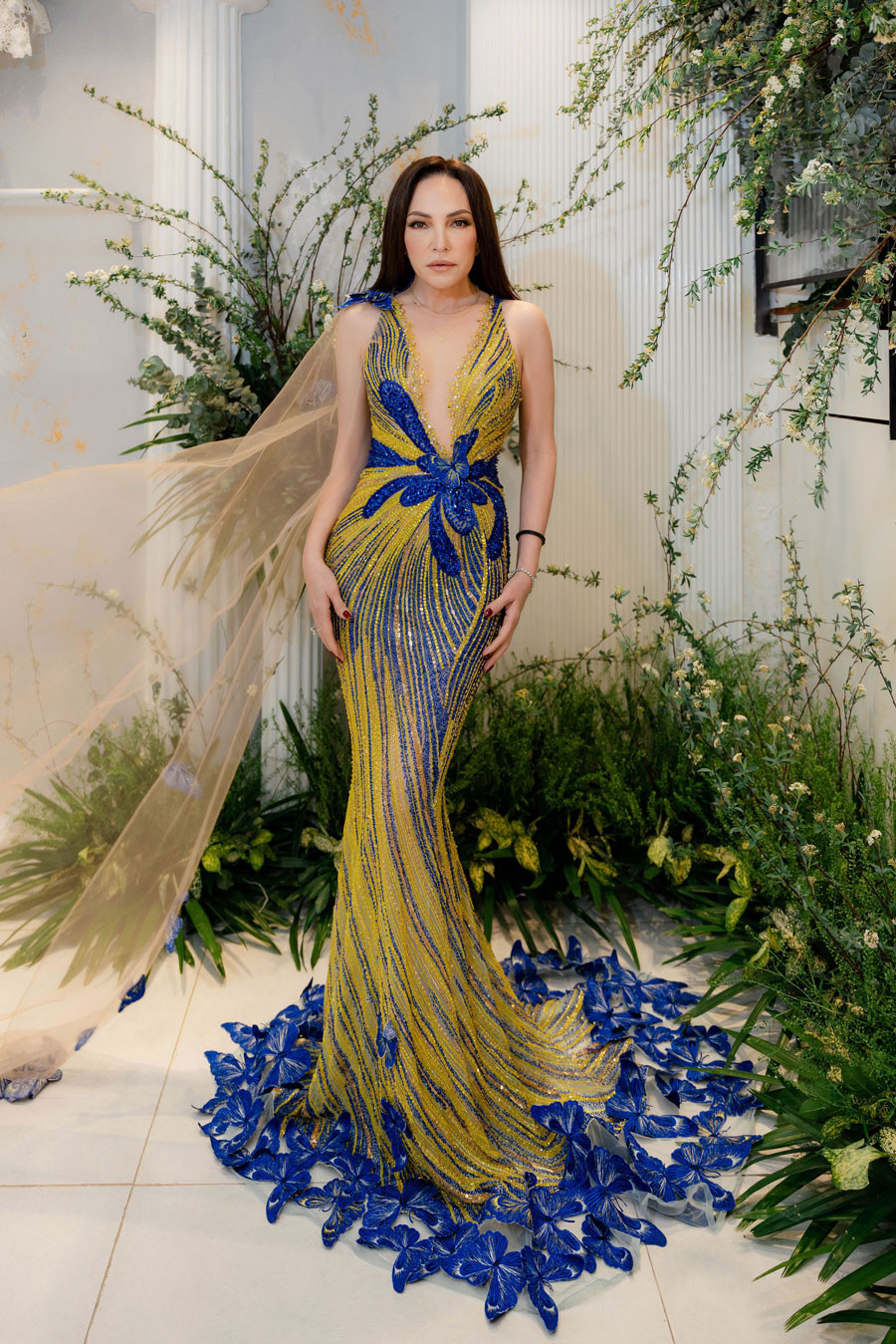 Những chiếc đầm lấy cảm hứng từ vẻ đẹp quý tộc của phụ nữ phương Tây đồng điệu với nhan sắc hoa hậu Thu Hoài.