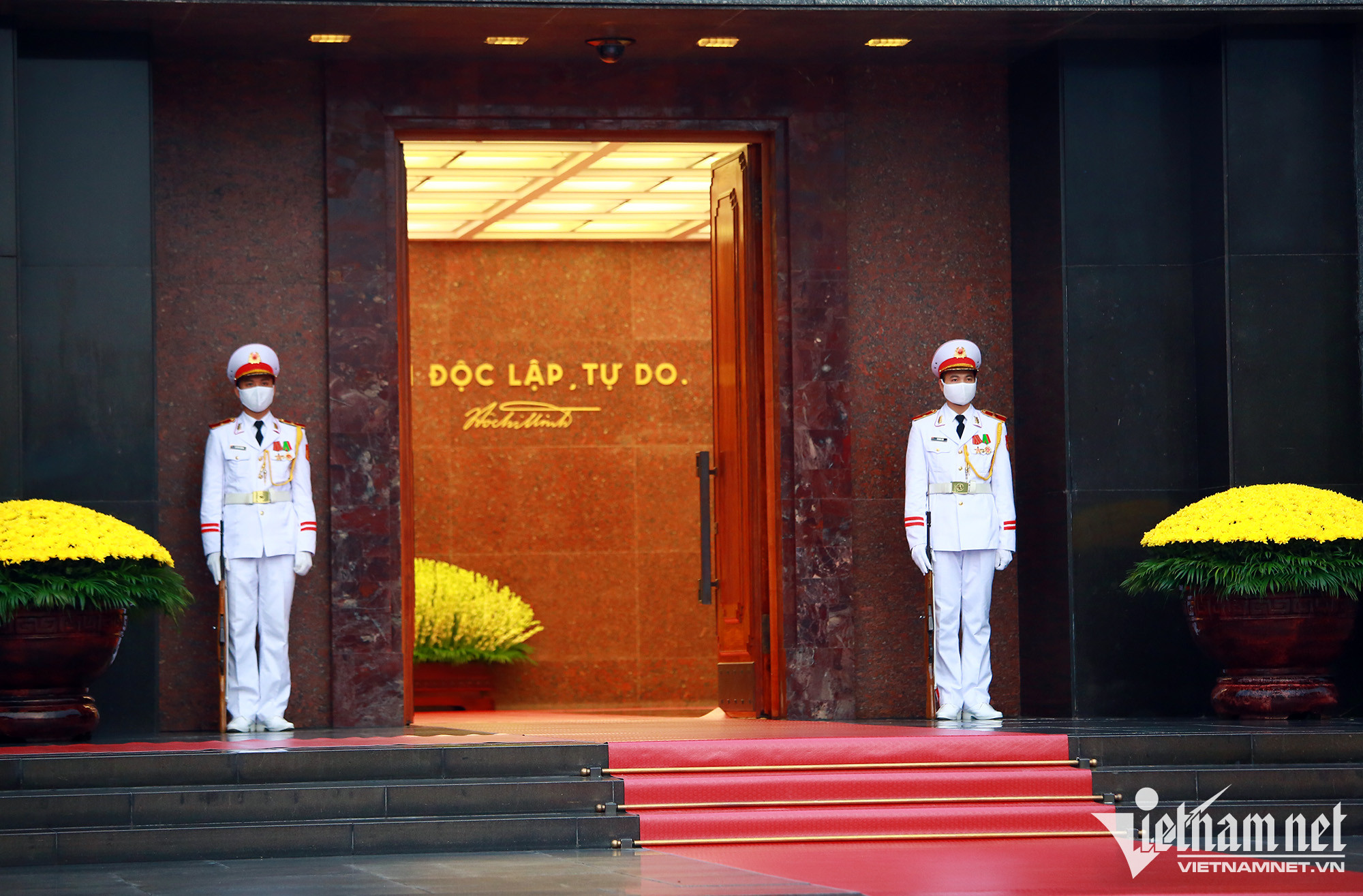 Khi các chiến sĩ tiêu binh chuẩn thực hiện nghi lễ là lúc cửa Lăng Chủ tịch Hồ Chí Minh được mở ra. Bên trong nổi bật dòng chữ: Không có gì quý hơn độc lập, tự do.
