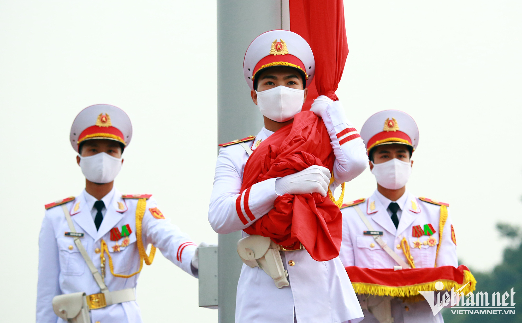 Ngay sau hiệu lệnh chào cờ, tiếng Quốc ca Việt Nam vang lên hào hùng, lá cờ được chiến sĩ đội Hồng kỳ dần tung lên.