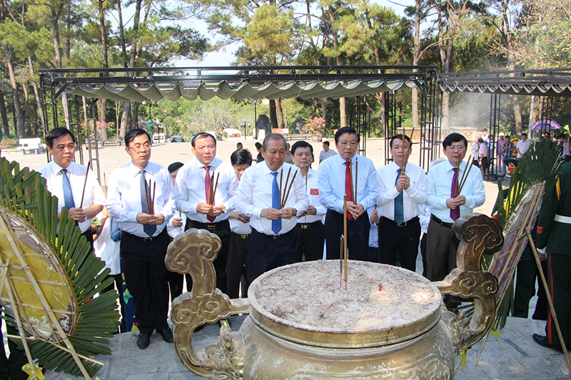 | Phó Thủ tướng Thường trực Trương Hòa Bình, Trưởng Ban Nội chính Trung ương Phan Đình Trạc và lãnh đạo tỉnh đặt vòng hoa, dâng hương tại nghĩa trang Liệt sĩ quốc gia Đường 9 |