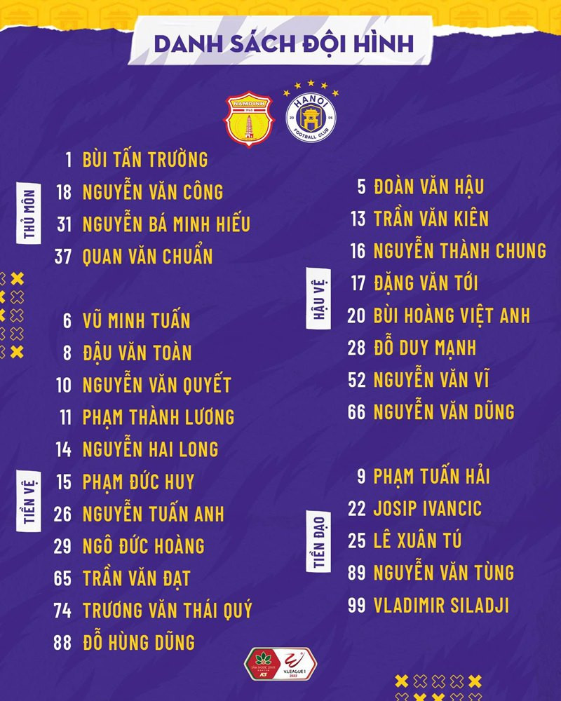 Ban huấn luyện CLB Hà Nội vẫn chưa mạo hiểm điền tên Đoàn Văn Hậu vào danh sách thi đấu ở trận đá bù với Nam Định dù hậu vệ quê Thái Bình đã hoàn toàn bình phục chấn thương.
