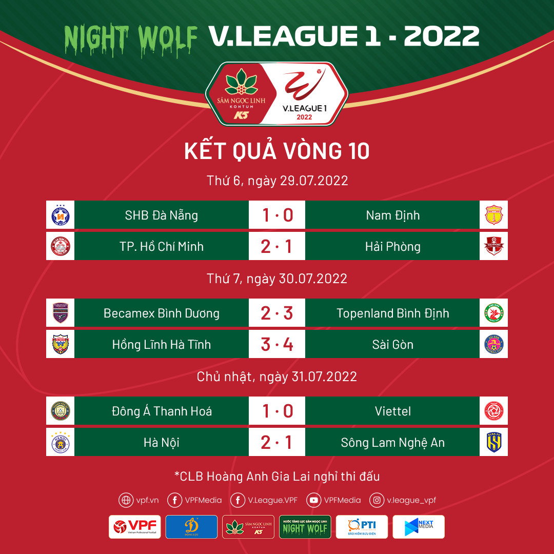 Lịch thi đấu vòng 10 V-League 2022