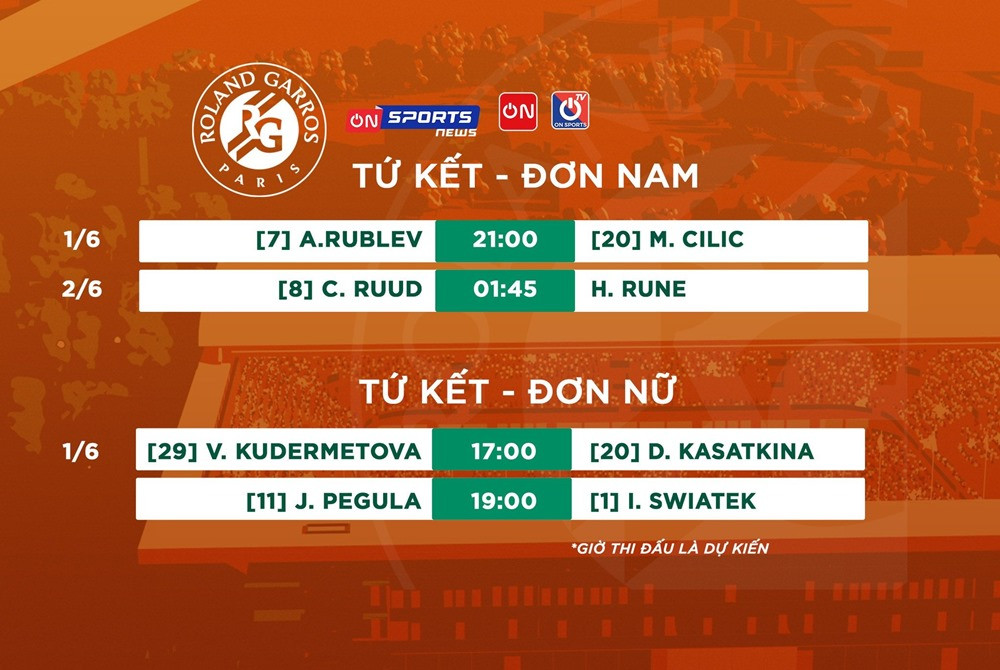 Cung cấp lịch thi đấu và kênh phát sóng trực tiếp giải quần vợt Pháp mở rộng - Roland Garros 2022 hôm nay (1/6), với vòng tứ kết đơn nam và đơn nữ.