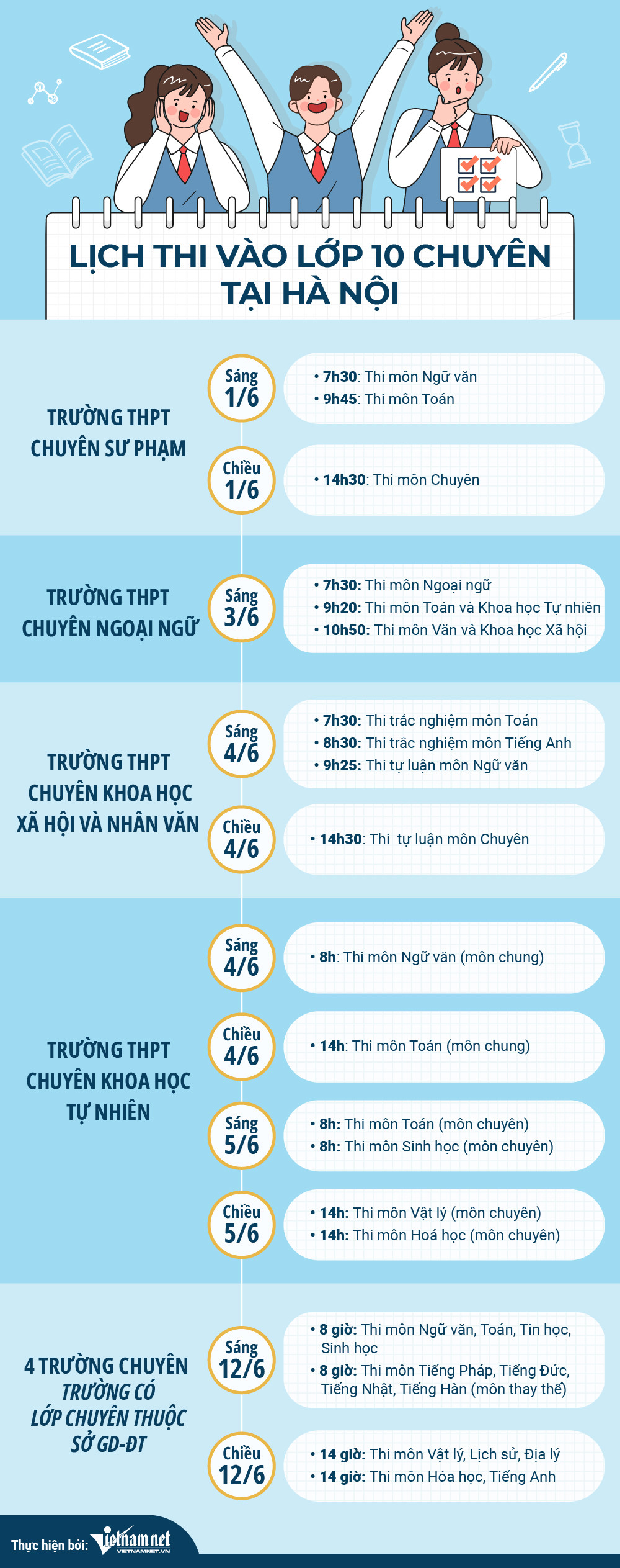 Bốn trường THPT chuyên trực thuộc các đại học gồm Chuyên Khoa học Xã hội và Nhân văn, Chuyên Ngoại ngữ, Chuyên Khoa học tự nhiên và Chuyên ĐH Sư phạm Hà Nội đều tổ chức thi tuyển lớp 10 với lịch sát nhau, kéo dài từ 1 - 5/6.