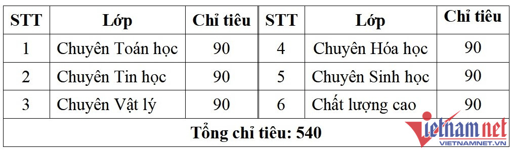 Năm 2023, Trường THPT Chuyên Khoa học Tự nhiên tuyển 540 chỉ tiêu, cụ thể như sau: