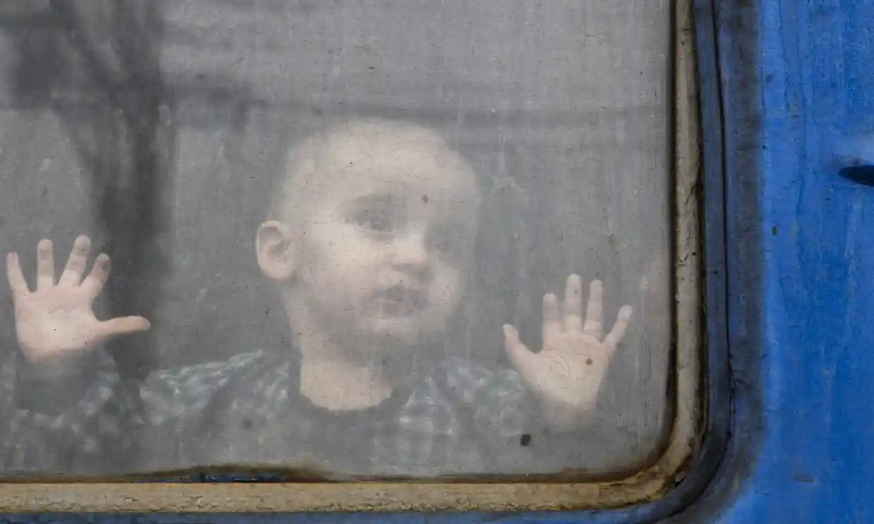 | Một đứa trẻ nhìn từ cửa sổ toa tàu đang rời khỏi thành phố Kramatorsk, miền đông Ukraine, hồi cuối tháng 2. Ảnh: AP |