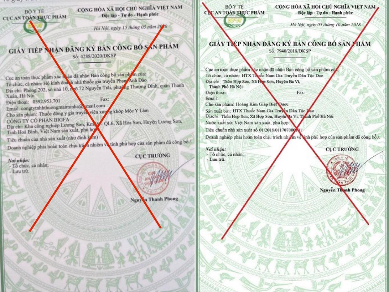 Theo đó, Cục An toàn thực phẩm (Bộ Y tế) phát hiện "Giấy tiếp nhận đăng ký bản công bố sản phẩm" của Hoàng Kim Giáp Biệt Dược (ngày 5.10.2018) là giả mạo.