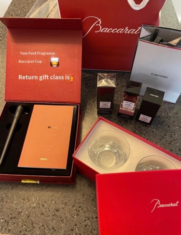 Khách mời đám cưới còn nhận được một hộp quà kỷ niệm của cô dâu và chú rể thay lời cảm ơn. Cặp tình nhân nổi tiếng xứ Hàn dành cho khách dự đám cưới 3 chai nước hoa Tom Ford, một máy nâng cơ mặt và 2 chiếc cốc pha lê Baccarat. Đây đều là những món đồ xa xỉ.