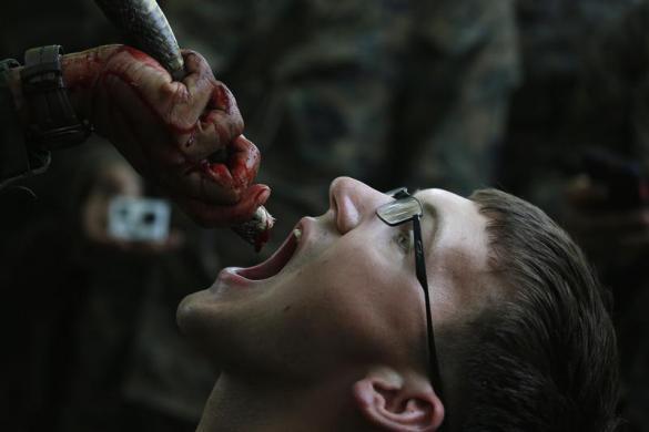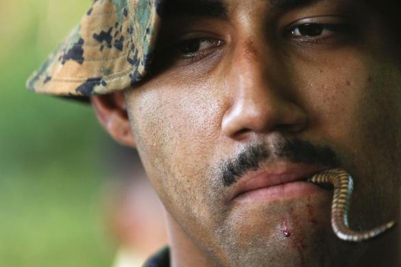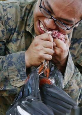 Các lính thủy đánh bộ của Mỹ đã phải uống máu tươi của rắn hổ mang, và ăn sống một con gà tại cứ cứ quân sự tỉnh Chon Buri, hôm 20/2.