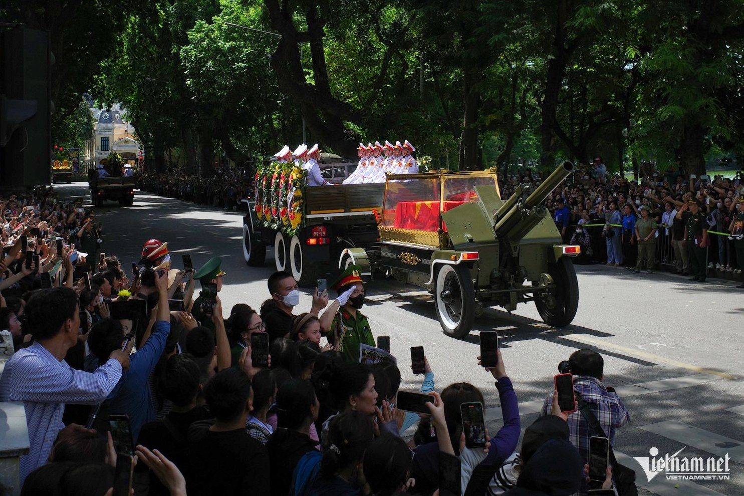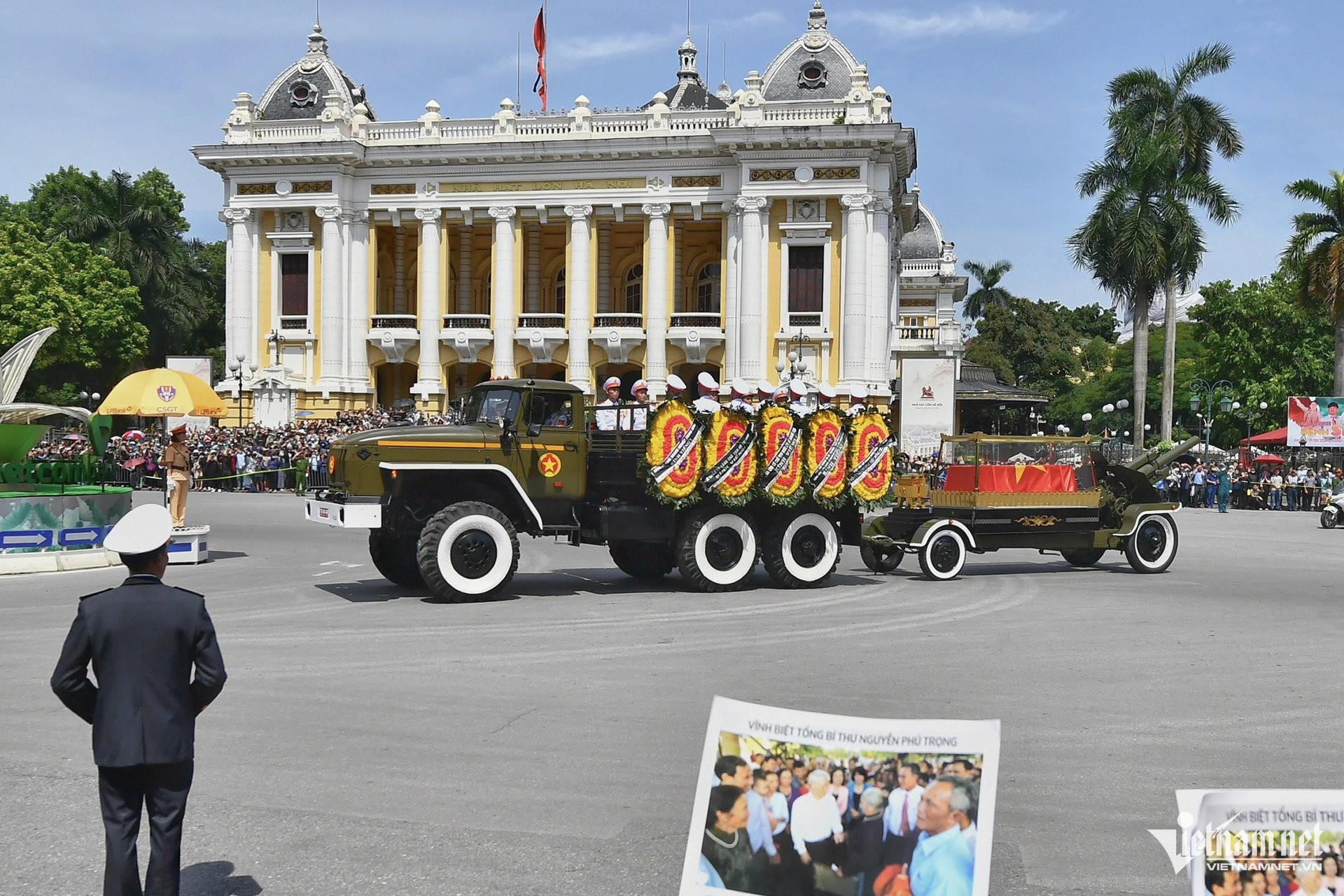 Đoàn xe đưa linh cữu Tổng Bí thư Nguyễn Phú Trọng đi qua các tuyến phố có nhiều công trình nổi tiếng như Nhà hát Lớn, Trung tâm Hội nghị Quốc gia, sân vận động Mỹ Đình... rồi tiến vào Nghĩa trang Mai Dịch (Hà Nội).