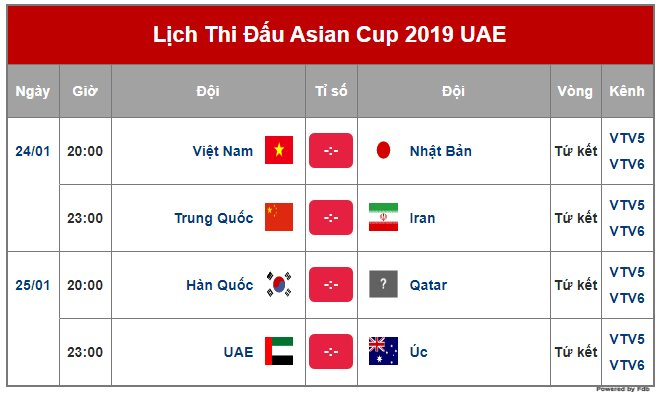 Chính thức lịch tường thuật trực tiếp vòng Tứ kết Asian Cup 2019