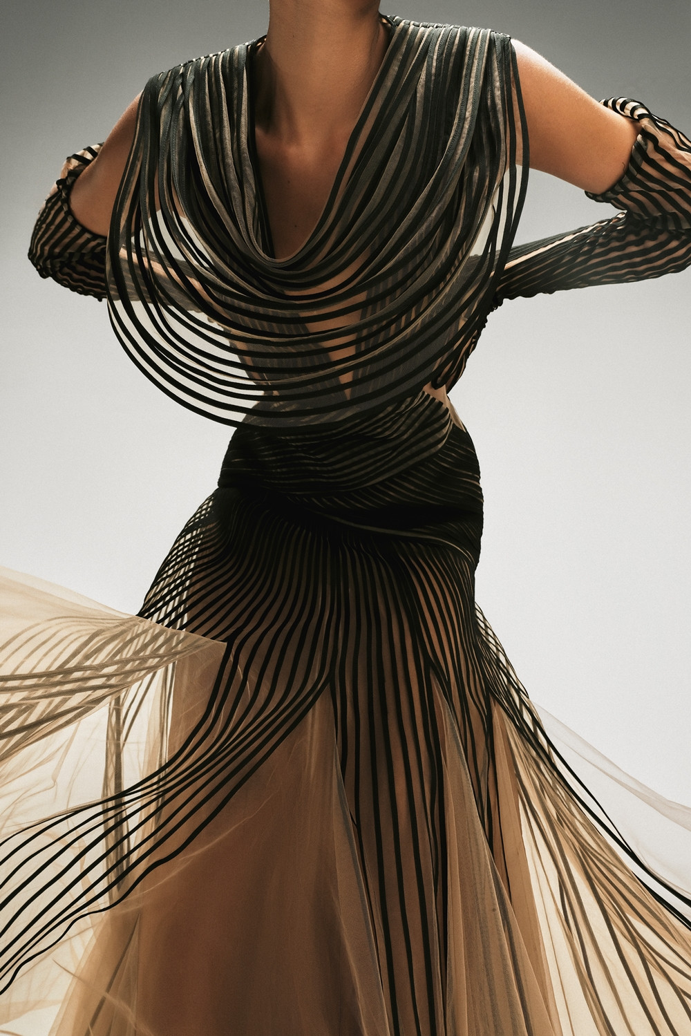 Trên nền các chất liệu như taffeta, lông vũ, wool crepe và organza, khán giả nhận ra một số kỹ thuật quen thuộc của NTK Công Trí như chạy dây taffeta, thêu đính, cut-out, drapping, đan móc và cả những chiếc nơ origami.