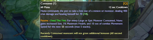 - (HIỆU ỨNG MỚI) Nội tại - Feed the Yeti: Với mỗi quái rừng lớn hoặc khủng bị Nuốt Chửng, Nunu nhận thêm 10 tốc độ di chuyển ngoài giao tranh và 3% lượng máu tối đa trong (50 + 5 mỗi cấp độ) giây (tối đa 5 điểm cộng dồn).