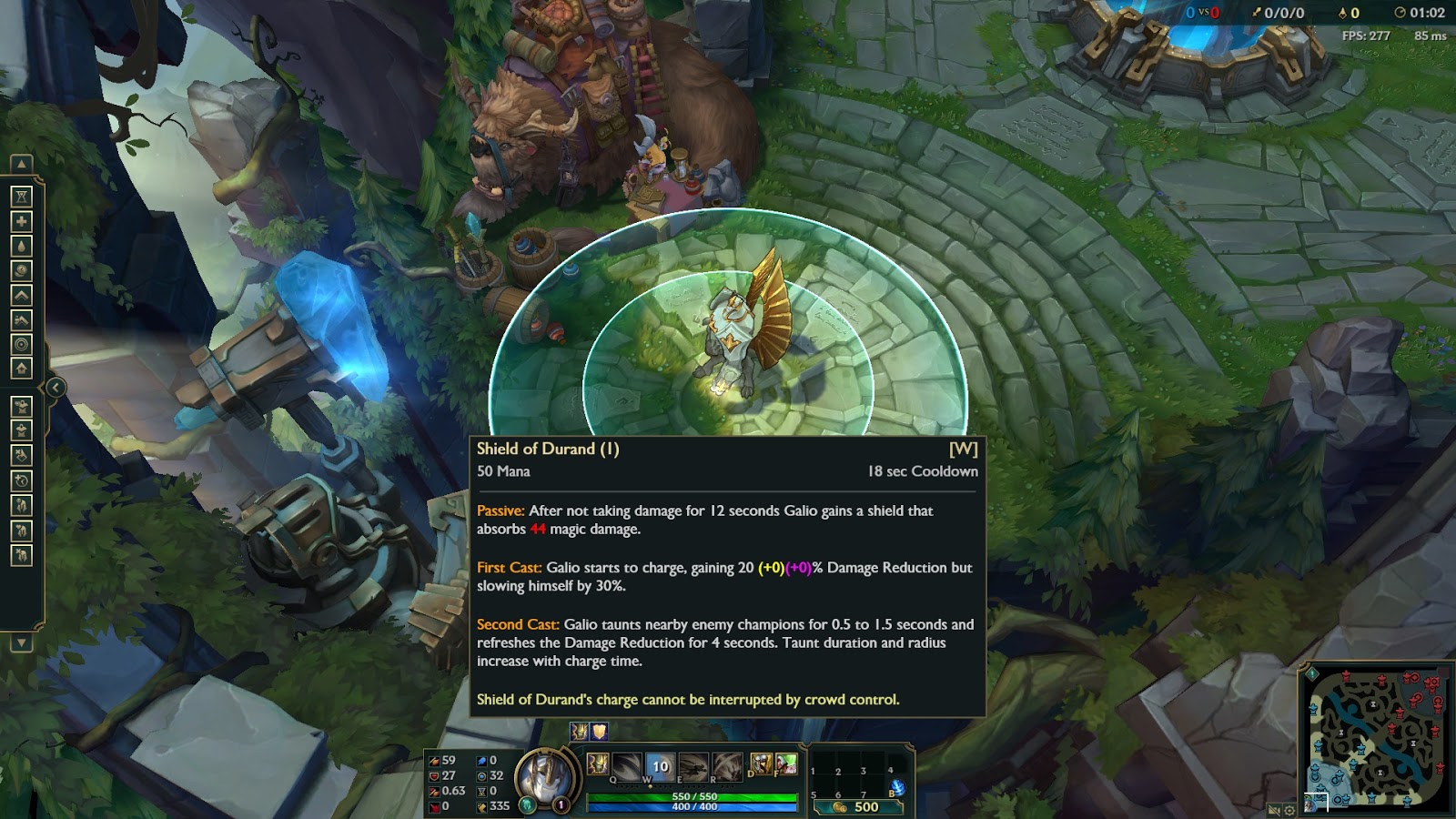 Galio định hình vị trí hiện tại của tướng đồng minh để đáp xuống điểm đó và tăng [20/30/40 (+ 8% mỗi 100 kháng phép cộng thêm)] giảm sát thương tới những đồng minh trong vùng ảnh hưởng.