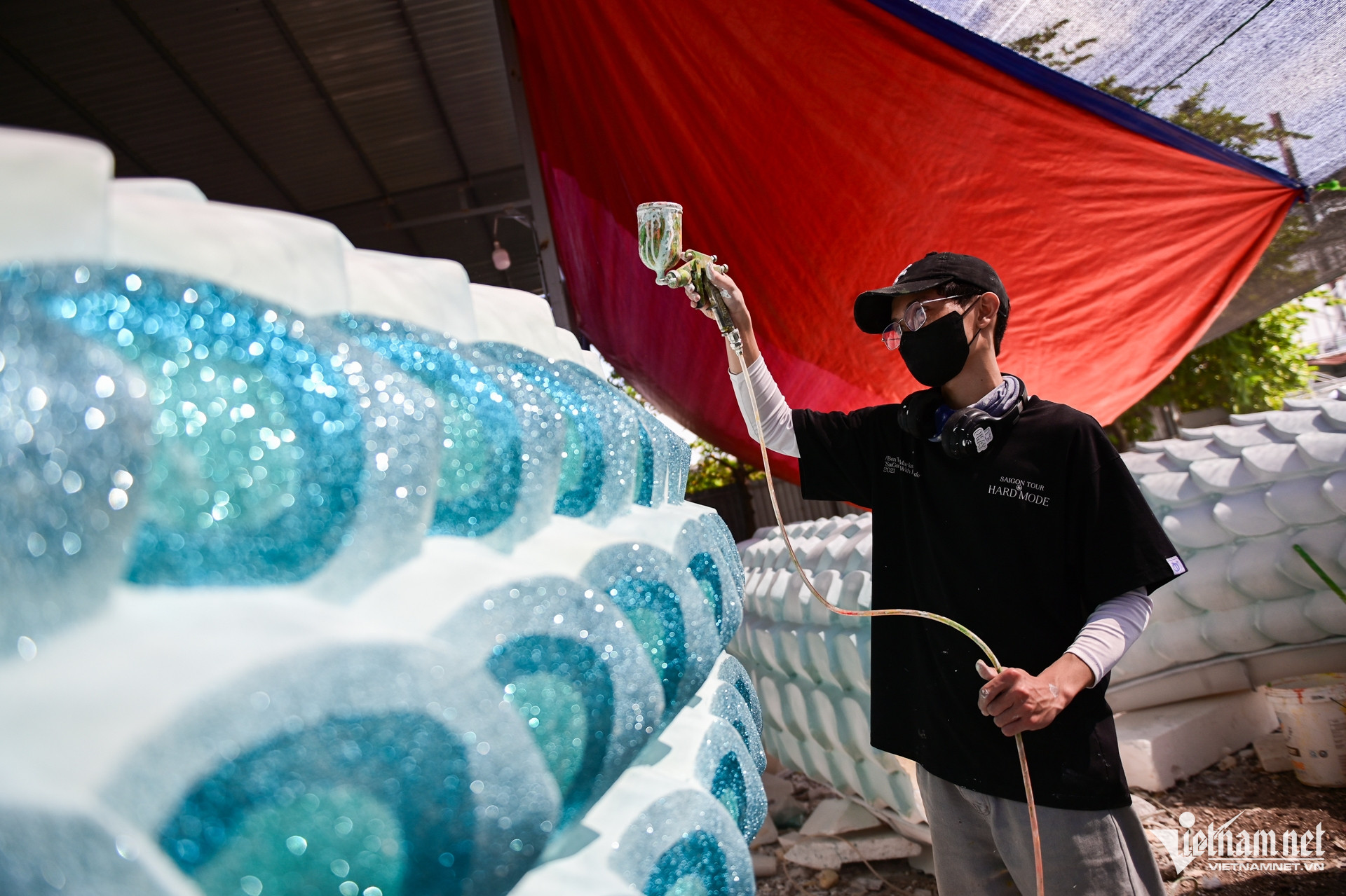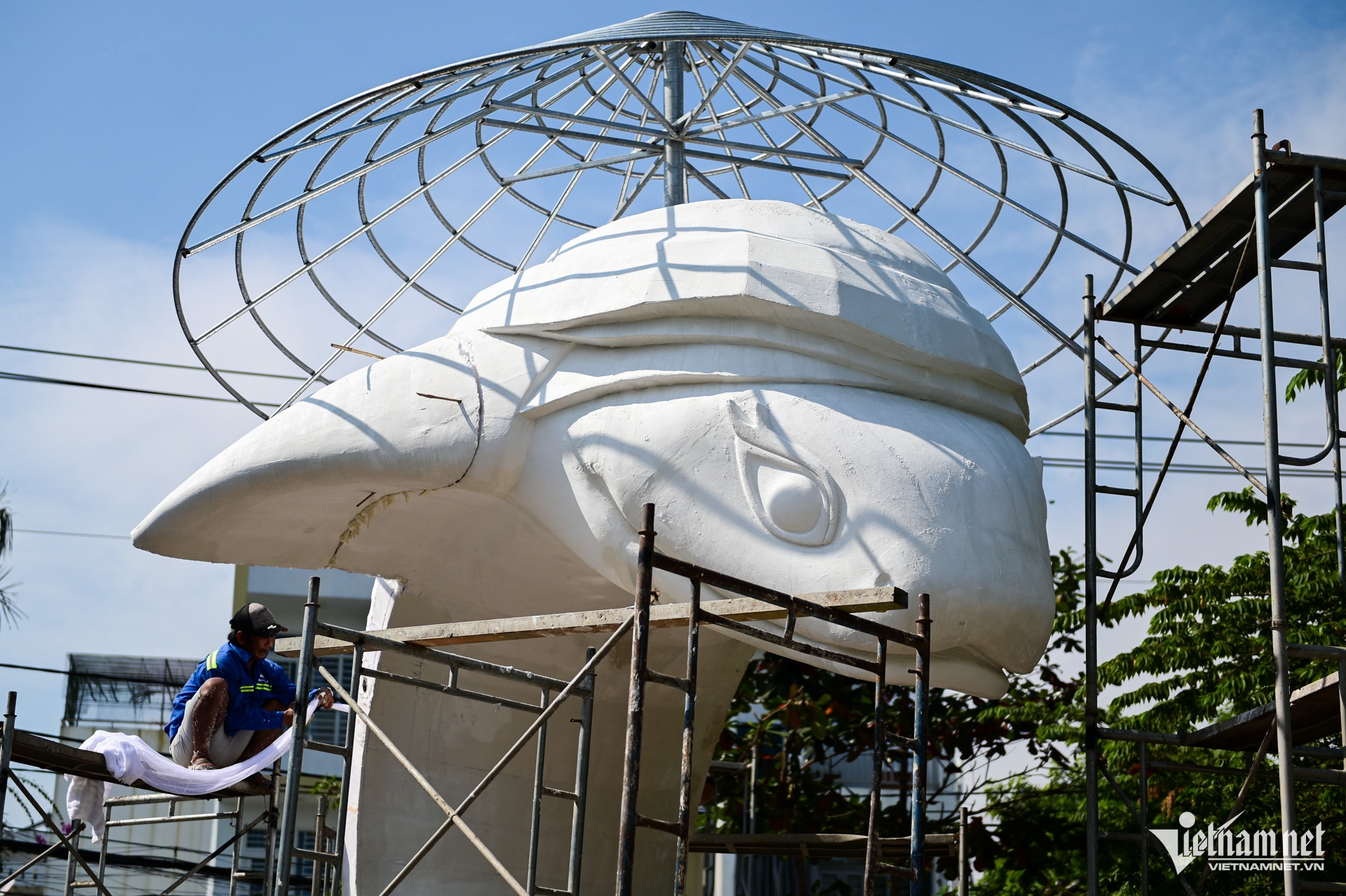 50 mét thân của Nàng Tỵ được sơn màu xanh ngọc lam, toàn bộ phủ óng ánh. Dự kiến khoảng 5 ngày nữa, linh vật sẽ được hoàn thành và di chuyển đến đường hoa để lắp đặt theo kế hoạch.