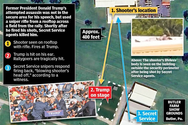 Nhà chức trách cho biết mái của tòa nhà, nơi nghi phạm nổ súng, nằm bên ngoài địa điểm cựu Tổng thống Donald Trump tổ chức cuộc vận động tranh cử ở thành phố Butler thuộc bang Pennsylvania hôm 13/7. Một phân tích của hãng tin CNN cho thấy, mái nhà chỉ cách nơi ông Trump đứng khoảng 120-150m.