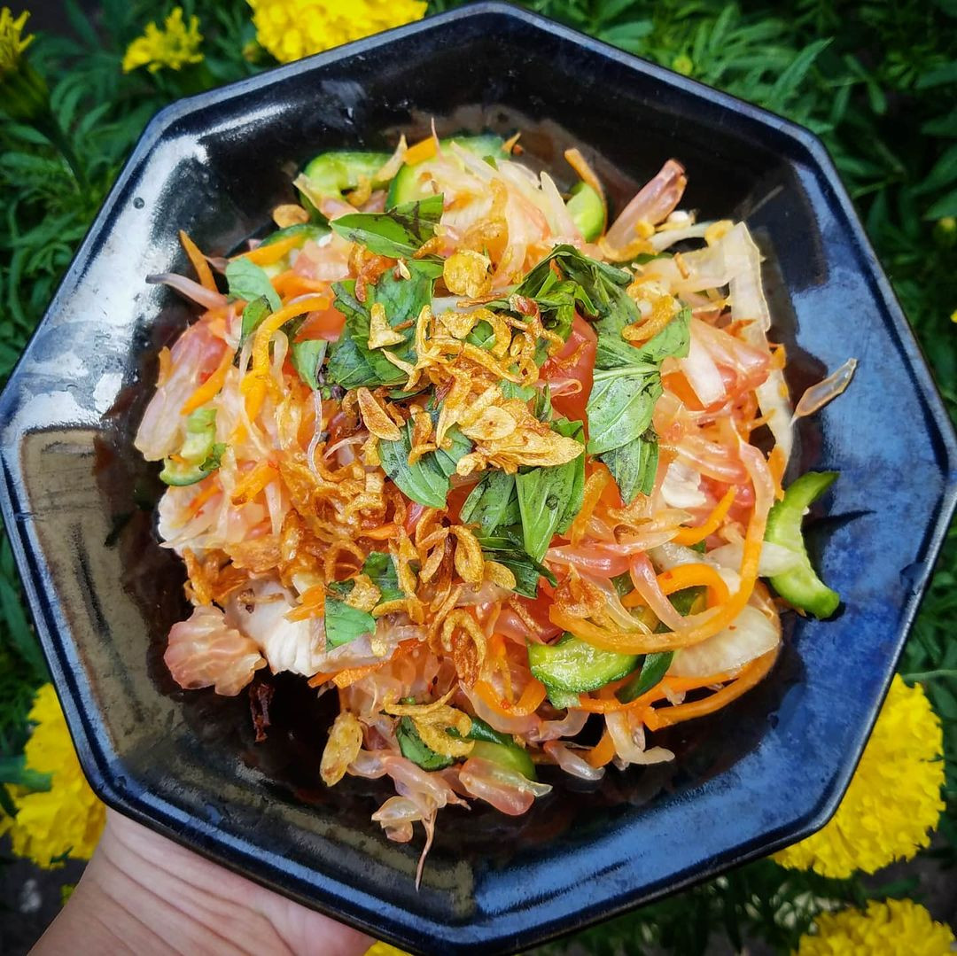 Gỏi bưởi thường được ăn kèm với phồng tôm giòn rụm. Giá món ăn này khoảng 100.000 - 150.000 đồng một đĩa.