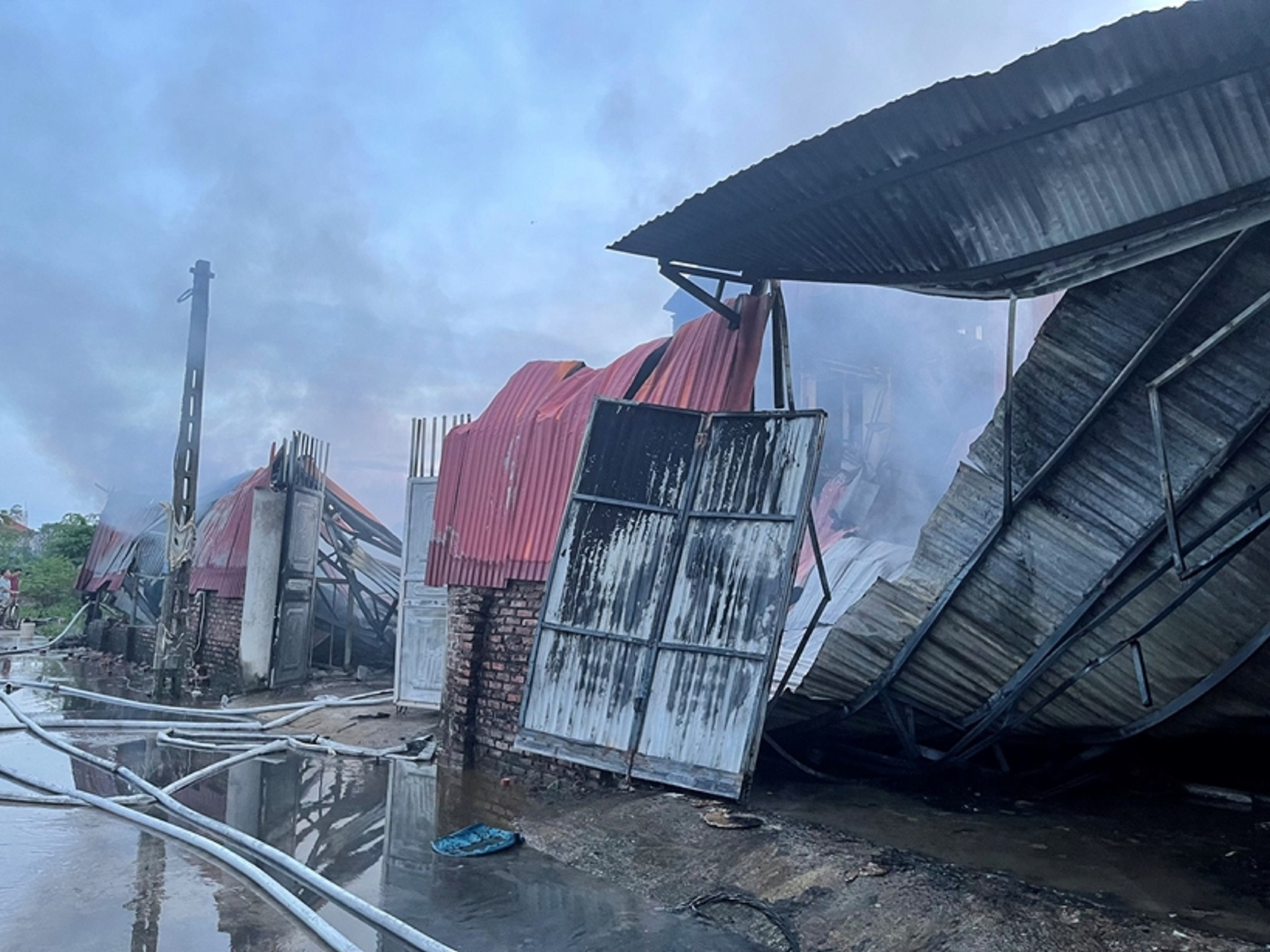 Trước đó, chiều 10/9, gia đình chị Vũ Thị V. (29 tuổi, chủ xưởng sản xuất) gọi thợ đến làm thêm mái tôn để chứa hàng. Quá trình làm, người thợ hàn cắt bất cẩn khiến tia lửa bén vào đệm xung quanh.