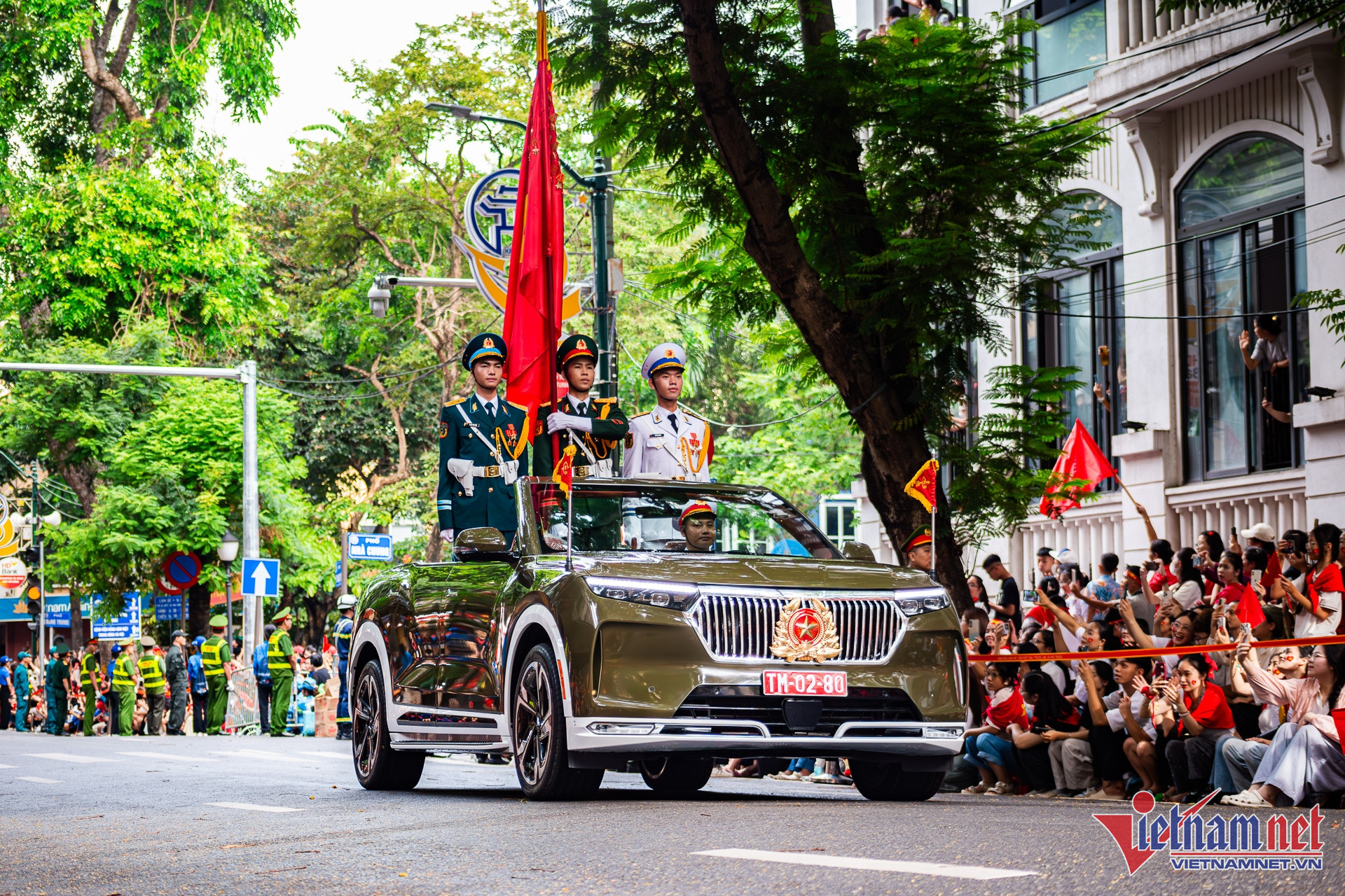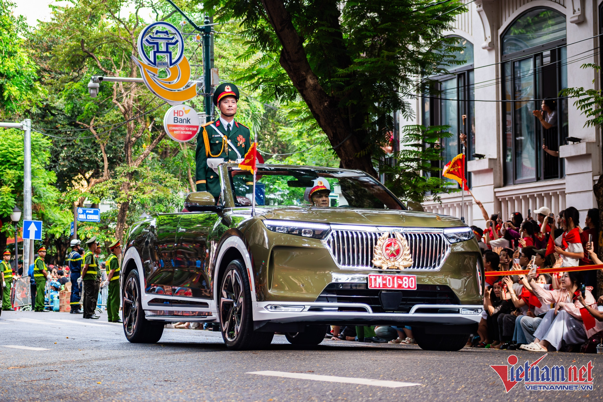 Gây chú ý và được nhiều quan tâm tại các buổi sơ duyệt, tổng duyệt diễu binh A80 lần này còn có VinFast VF 9. Ấn tượng nhất là 10 chiếc VF 9 mui trần dẫn đầu đoàn chỉ huy, mang ngoại thất màu xanh lục kết hợp cùng màu trắng. Xe đã cắt bỏ mui, toàn bộ trụ B, C, D và nâng khoảng sáng gầm thêm hơn 20 mm.