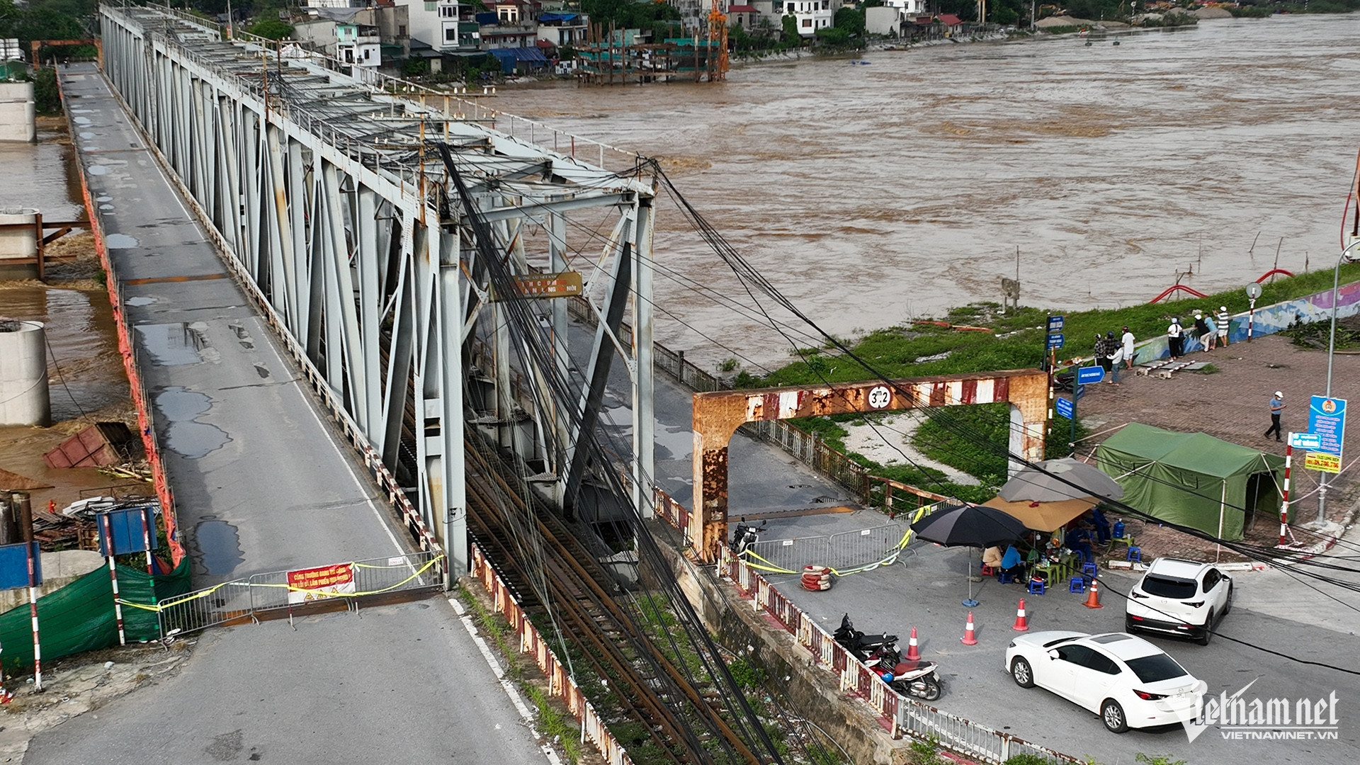 Tròn 48 giờ sau khi được thông báo: "Nước lũ trên sông Hồng và nhiều sông ở Bắc Bộ có xu thế giảm" nhưng nhìn từ trên cao chưa thấy có nhiều thay đổi.