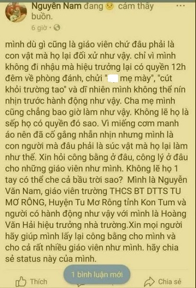 “Mình dù gì cũng là giáo viên chứ đâu phải là con vật mà họ lại đối xử như vậy. Chỉ vì mình không đi nhậu mà hiệu trưởng lại có quyền 12h đêm về phòng đánh, chửi “… mẹ mày”, “cút khỏi trường tao” và dĩ nhiên mình không thể nín nhịn trước hành động như vậy…” - thầy Nam viết trên Facebook cá nhân và kêu gọi mọi người chia sẻ để đòi lại công bằng.
