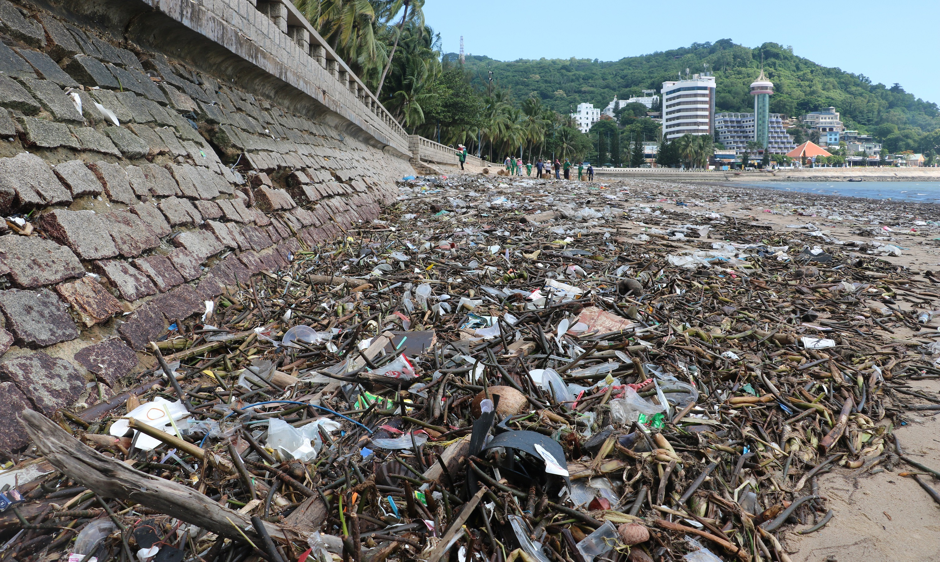 Chiều 8/8, ghi nhận dọc bờ biển Bãi Trước, hàng chục tấn lục bình cùng gỗ khô, bao nilon, vỏ ly nhựa… theo dòng nước dạt vào bờ, kéo dài hơn 1km.