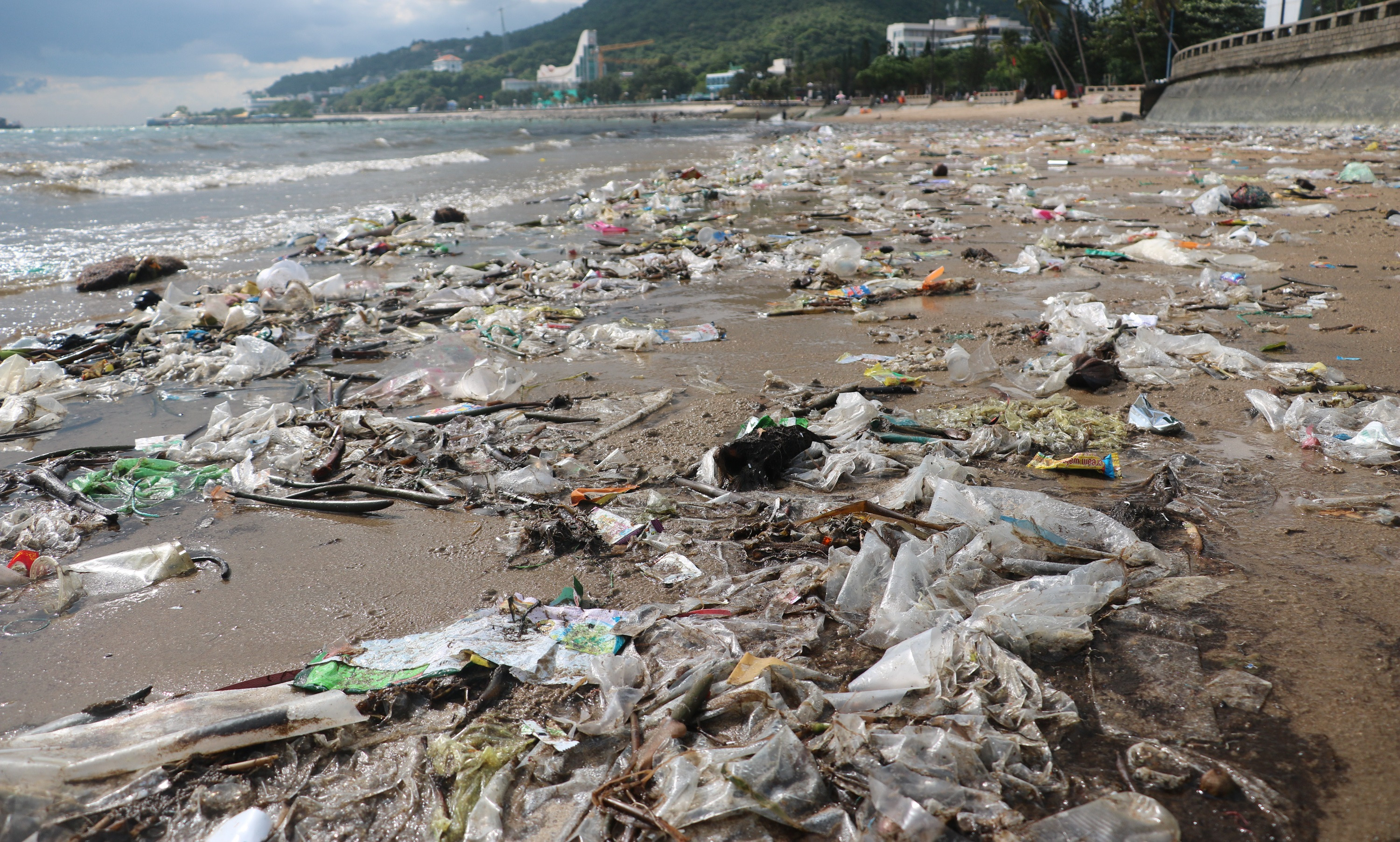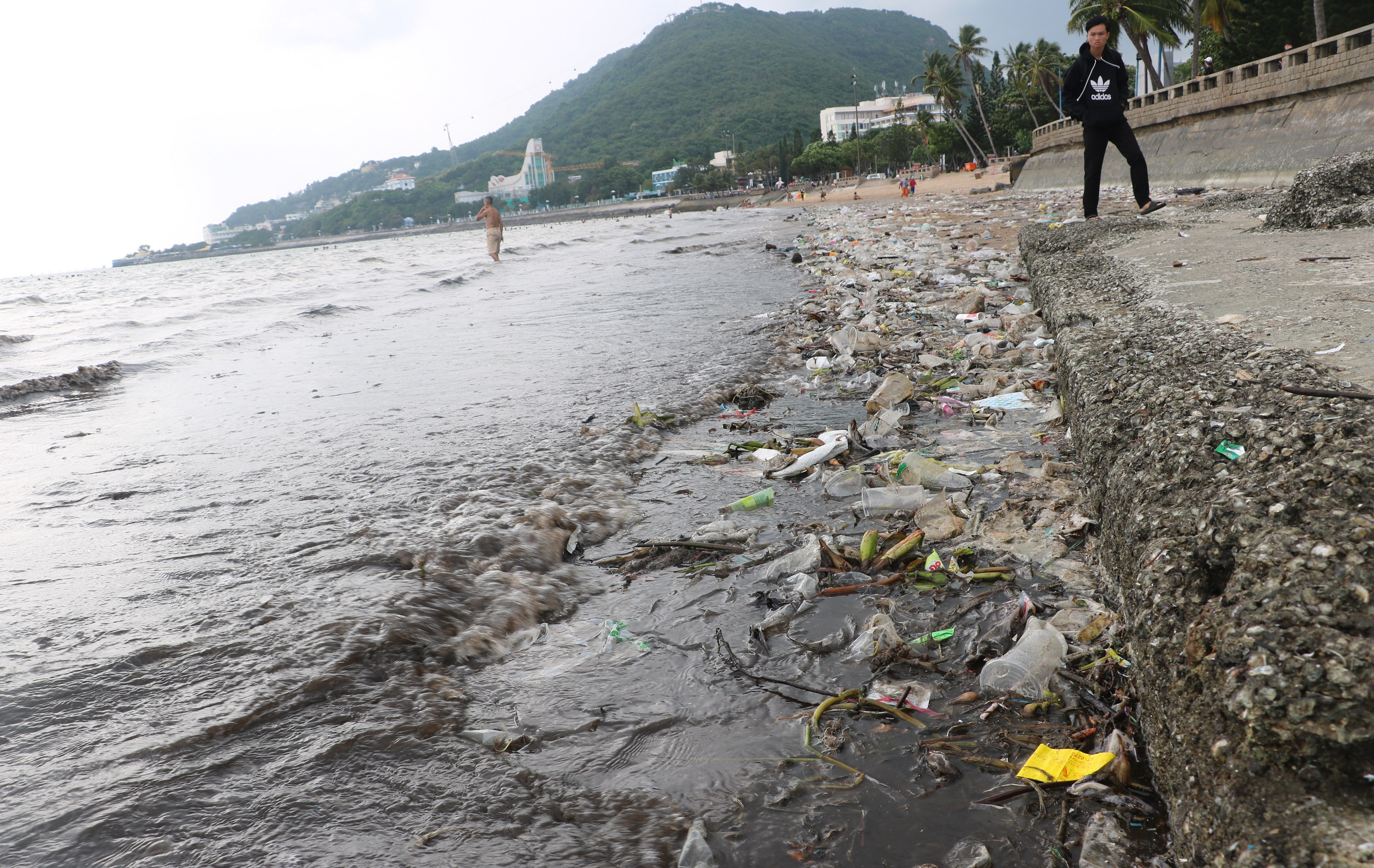 Sát mép biển, lục bình phân huỷ khiến dòng nước đen đục, vỏ nhựa kèm bao nilon nổi lềnh bềnh.