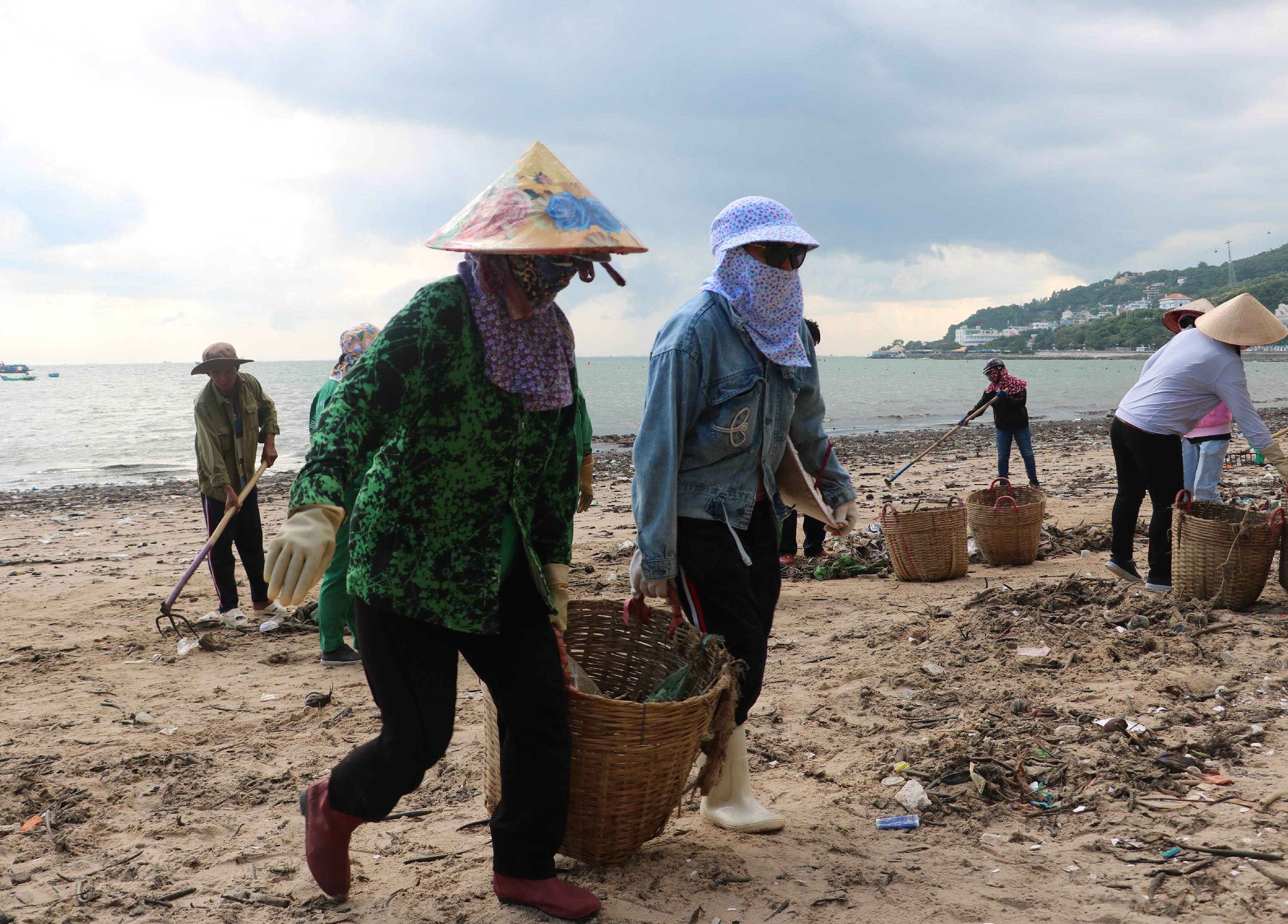 Trên bờ, hàng chục công nhân Công ty CP dịch vụ môi trường và công trình đô thị TP Vũng Tàu kéo vớt, thu gom rác để xe chuyên dụng tới chở đi xử lý.