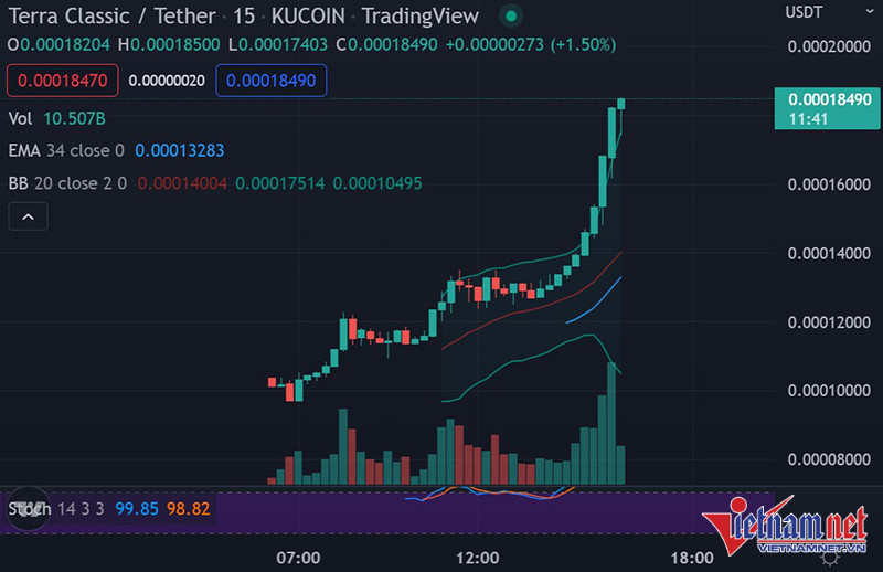 Theo ghi nhận của VietNamNet, so với thời điểm sáng nay, giá LUNC trên sàn giao dịch KuCoin đã tăng tới hơn 100%. Từ mức giá 0,00097 USD lúc 7h sáng nay, giá token LUNC hiện đã tăng lên mức 0,000185 USD.