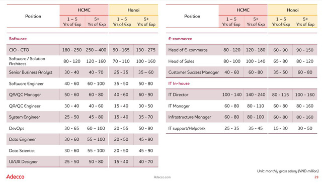 Tương tự ở Hà Nội, mức lương tuy không cao ngất ngưởng như ở TP. HCM nhưng vẫn thuộc hàng top với 130-275 triệu cho người trên 5 năm kinh nghiệm, từ 1-5 năm kinh nghiệm được trả 90-165 triệu/tháng.