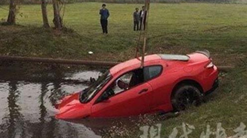 Chiếc xe thể thao màu đỏ có giá tới 2 triệu nhân dân tệ, tức gần 7 tỷ đồng, đã bị chìm xuống ao nước.