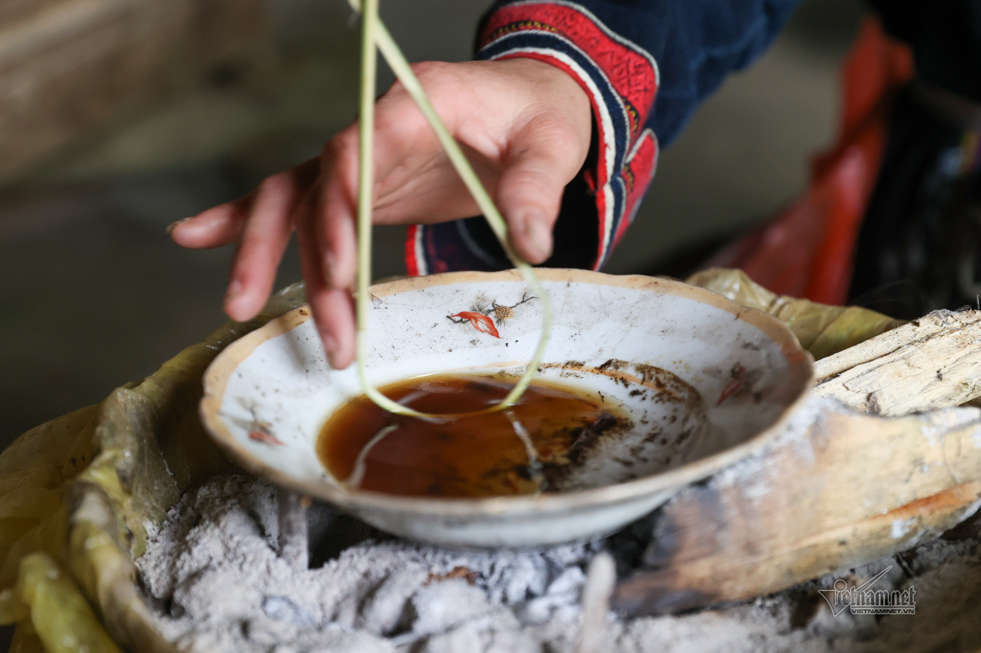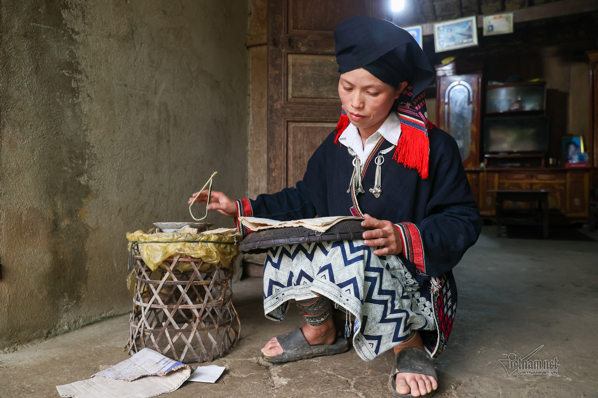 Theo chân chị, chúng tôi vào ngôi nhà vách đất, lợp nứa, lá theo kiểu truyền thống của người Dao Tiền. Tại đây, chị Liên giới thiệu cho đoàn kỹ thuật in hoa văn lên vải từ sáp ong độc đáo.