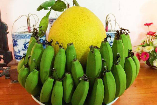 Mâm ngũ quả nhiều màu sắc của người miền Bắc thường gồm chuối, bưởi, đào, hồng, quýt, lê, cam, táo, trứng gà, phật thủ,...