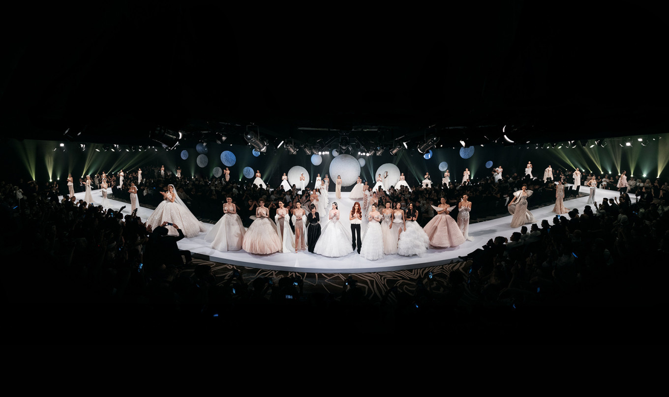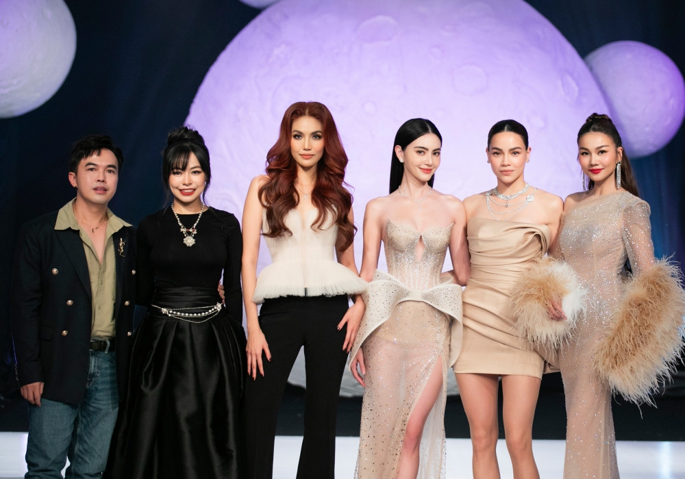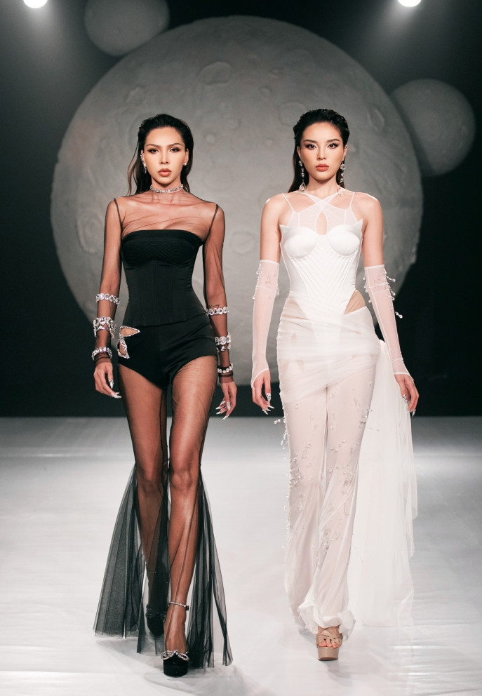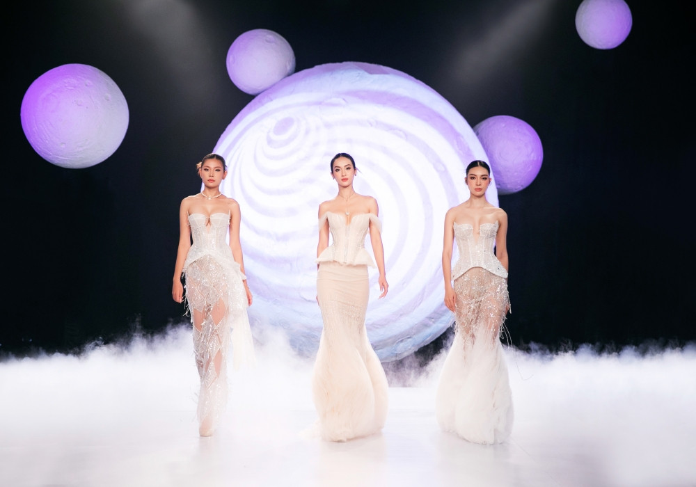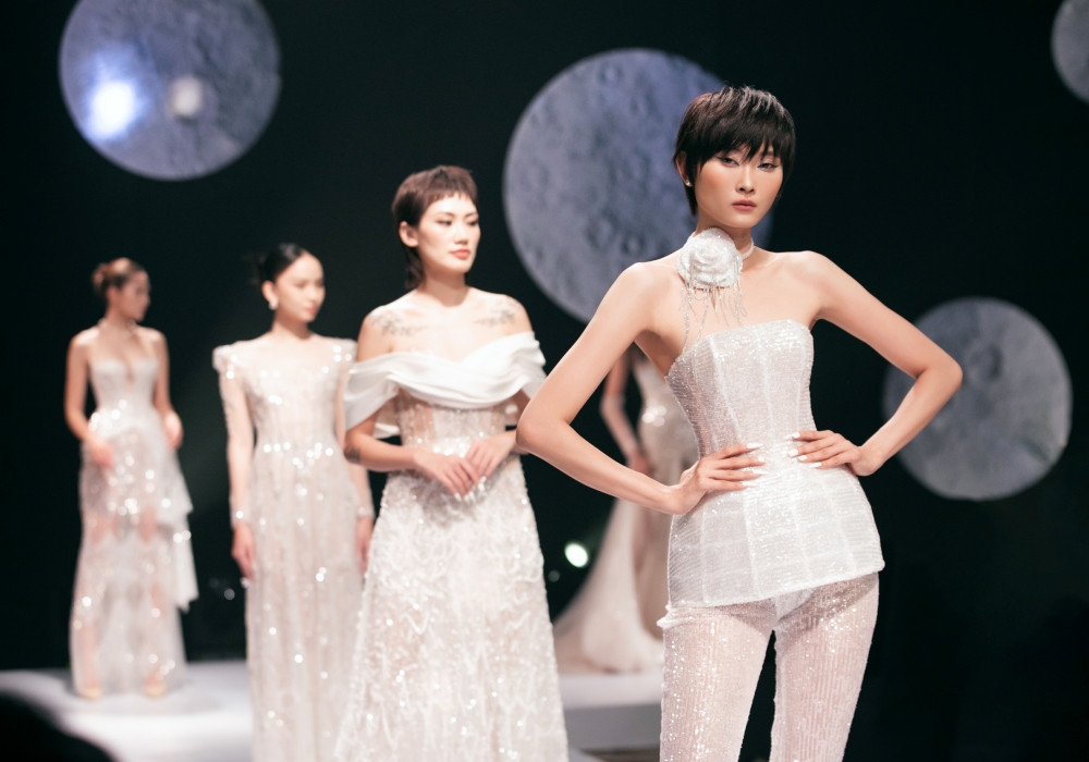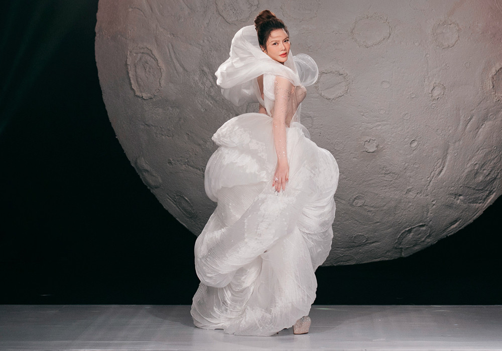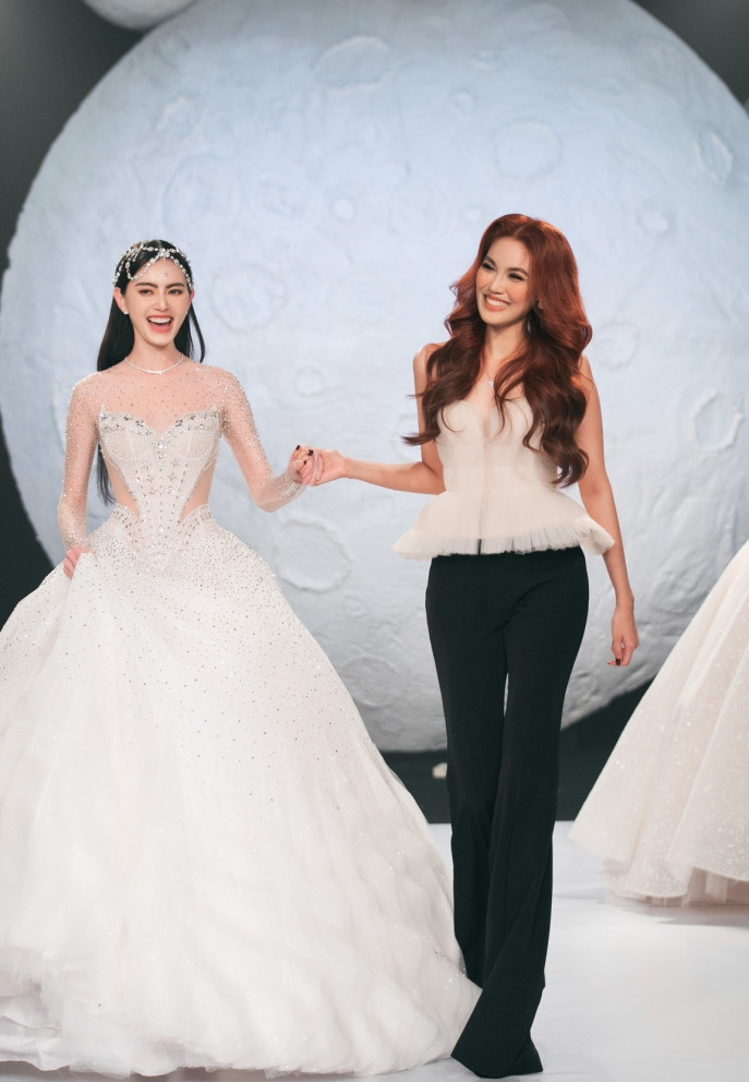Mai Davika hút ánh nhìn với gương mặt, thần thái nổi bật. Trong phần giao lưu cuối show, cô cho biết trở lại Việt Nam vì nhận được lời mời từ BTC và mong muốn gặp fan. Bộ đôi Hà Hồ - Thanh Hằng cùng đến xem show và mặc váy do chính Lan Khuê thiết kế. Sau 'The New Mentor', cả ba có mối quan hệ gắn bó và hiểu nhau hơn trên bước đường làm nghề.Minh Triệu - Kỳ Duyên diễn vedette cho bộ sưu tập đầu tiên trong chương trình. Cả hai mặc bộ trang phục sắc màu đối lập đen - trắng, catwalk dứt khoát, mạnh mẽ và đầy ăn ý khi sánh đôi.Thúy Ngân xuất hiện nổi bật với mẫu váy cưới đính kết đá từ thân đến chân váy. Người đẹp trở lại sàn catwalk vì những năm qua cô chủ yếu đóng phim và tham gia show thực tế.Bộ ba Như Vân - Mai Ngô - Lê Thu Trang được Lan Khuê mời trình diễn trong show thời trang kỷ niệm 10 năm làm nghề. Họ đều là mẫu chuyên nghiệp, có nhiều kinh nghiệm nên đều có kỹ năng trình diễn tốt. Với 100 mẫu thiết kế, Lan Khuê và người bạn - NTK Trà Linh mất hơn 3 tháng để thực hiện, từ lên ý tưởng thiết kế đến thành phẩm. Họ mang đến tinh thần váy cưới thời tương lai tối giản, họa tiết hình ngôi sao, vũ trụ, những hành tinh... thay cho các mẫu truyền thống như hiện nay. Chất liệu chính trong show diễn là metallic tạo nên sự lấp lánh kết hợp những đính kết nổi 3D. Sàn diễn hình số 8 do đạo diễn Trần Thành Trung thực hiện tạo sự mới lạ, giúp người xem dễ dàng nhìn thấy toàn bộ phần trình diễn. Tổng chiều dài sàn runway hơn 100m kết hợp công nghệ mapping 3D tăng hiệu ứng sân khấu. Lan Khuê xuất hiện ở cuối show cảm ơn khán giả và các đồng nghiệp. Cô cho biết đã hoạt động trong làng thời trang tròn 10 năm nhưng đến lúc này, khi ở vai trò một nhà thiết kế và tổ chức show, Lan Khuê mới thấm thía những vất vả mà các nhà thiết kế khác hay các stylist, đạo diễn… Nói lời tri ân mọi người, người đẹp nghẹn ngào rơi nước mắt.Lan Khuê - NTK Trà Linh chụp ảnh kỷ niệm cùng các nghệ sĩ góp mặt. Sau show diễn tại TP.HCM, các mẫu trang phục sẽ được mang sang trình diễn tại một tuần lễ thời trang quốc tế vào tháng 10. Clip Mai Davika làm vedette show diễn