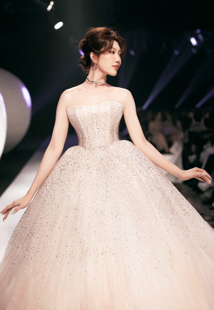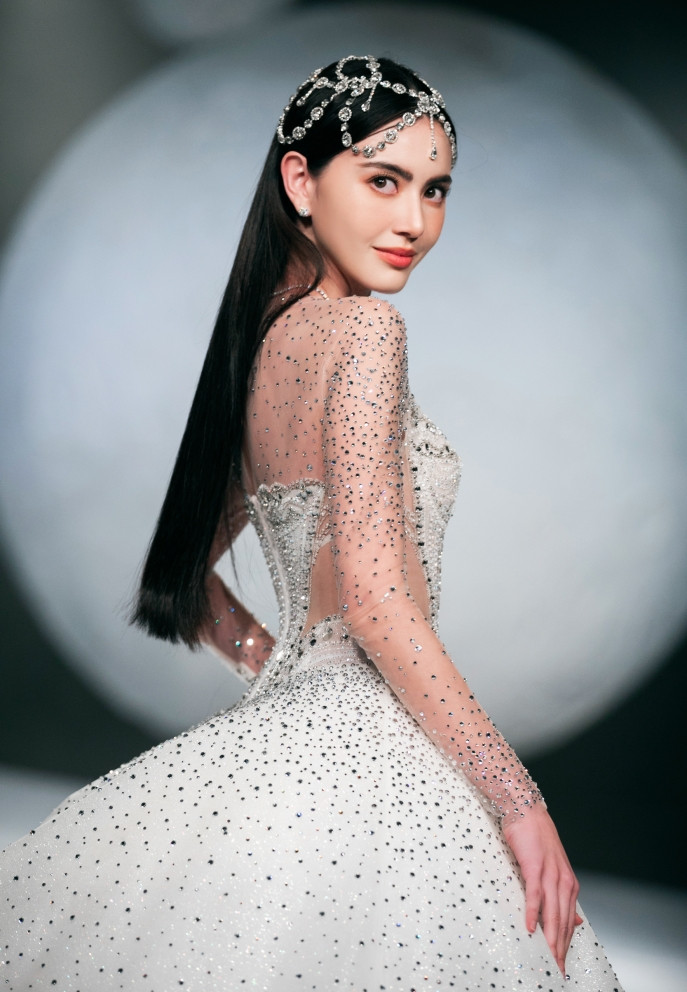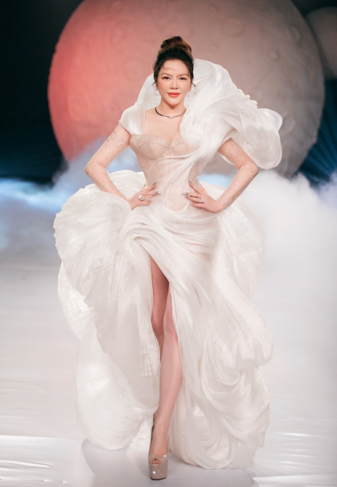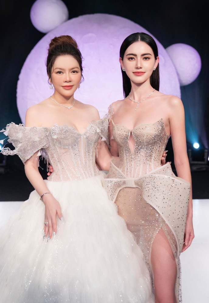 Lý Nhã Kỳ là gương mặt đặc biệt giữ vị trí mở màn show diễn "Aluminum" diễn ra tối 5/9 tại TP.HCM. Người đẹp diện mẫu váy lấy cảm hứng từ những đám mây với kỹ thuật tạo khối dựng cấu trúc thủ công trên nền chất liệu lưới dập ly. Phần thân váy đi khối hoạ tiết đá pha lê tạo hình thu gọn vòng eo và tôn lên khuôn ngực người mặc. Dù đây là lần hiếm hoi diễn thời trang nhưng Lý Nhã Kỳ khá tự tin với những bước đi dù mang giày cao hơn 15cm, váy áo cầu kỳ rất khó xoay chuyển. Cô không quên hoàn thiện sự xuất hiện của mình bằng set trang sức kim cương 1 tỷ đồng gồm nhẫn, hoa tai, vòng tay, dây chuyền, trong đó đắt nhất là vòng tay lấy ý tưởng từ trái tim.Lý Nhã Kỳ cho biết nhận lời Lan Khuê vì tin tưởng vào sự chuyên nghiệp của đàn em trong công việc và trước show 2 ngày mới biết mình sẽ diễn áo cưới. Tuy bất ngờ nhưng Lý Nhã Kỳ cũng cảm thấy thích thú. Cô cho rằng đó là ‘tín hiệu vũ trụ' gửi xuống, đã đến đúng thời điểm cô sẽ lên xe hoa.Lý Nhã Kỳ hội ngộ ngôi sao Mai Davika tại sự kiện. Mai Davika là mỹ nhân được săn đón hàng đầu tại làng giải trí Thái Lan và châu Á với hơn 18 triệu lượt theo dõi trên Instagram.