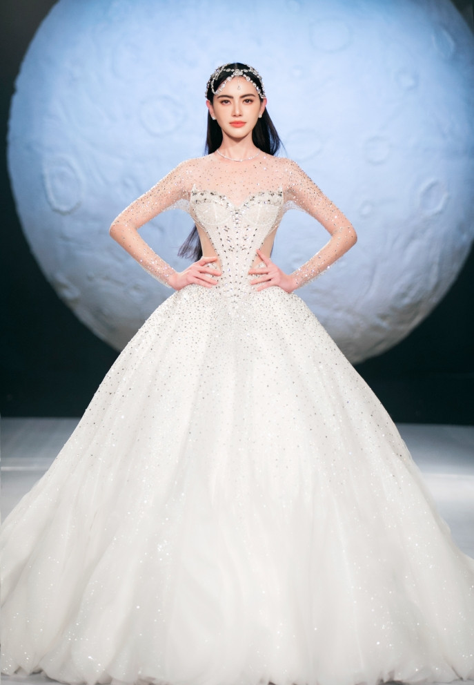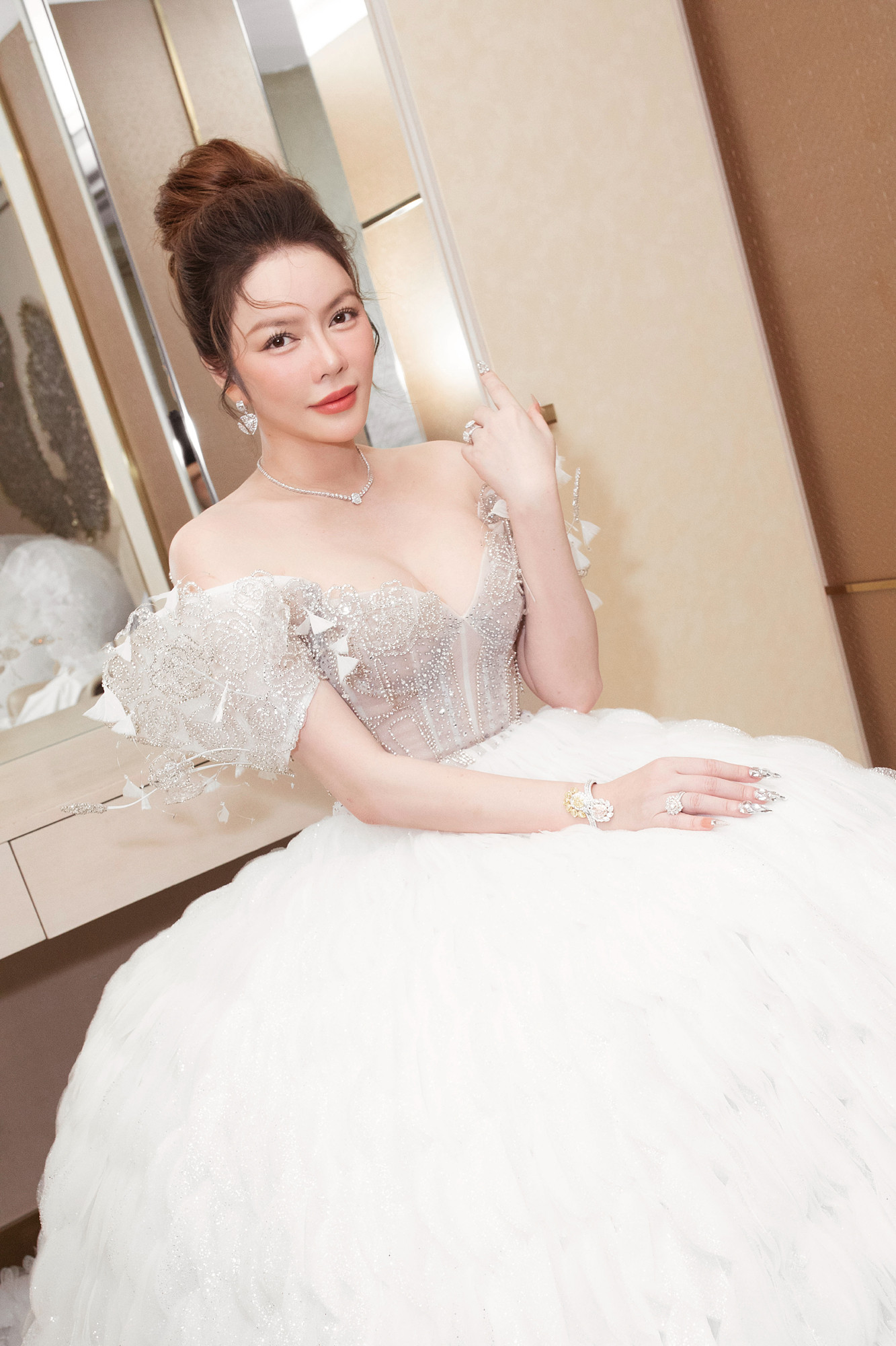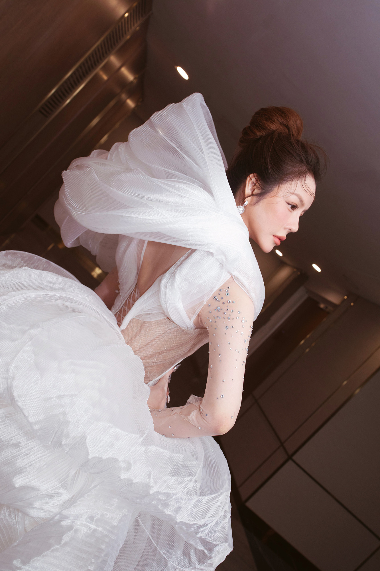 Lý Nhã Kỳ hóa cô dâu trong bộ váy cưới do Lan Khuê thiết kế. Nữ diễn viên nói đùa đây là 'tín hiệu vũ trụ' mong cô sớm kết hôn.