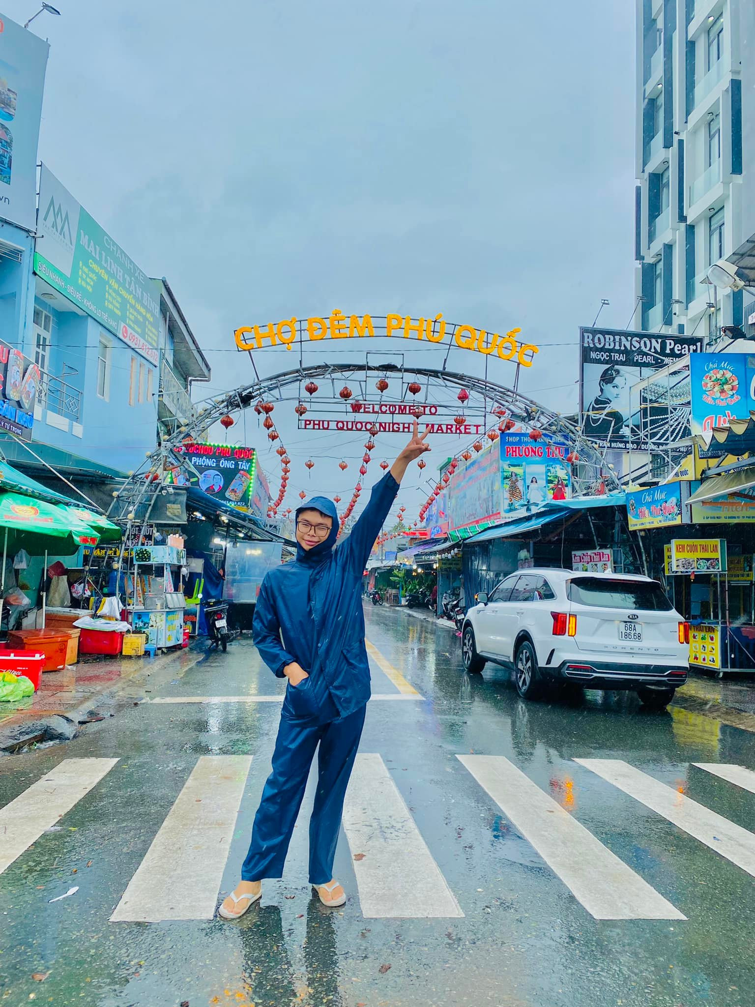 Nguyễn Minh Đức - một bạn trẻ làm du lịch tại Phú Quốc cũng "đội mưa" thực hiện bộ ảnh check-in hài hước. "Mục đích chính của mình là cập nhật thông tin thời tiết cho mọi người đồng thời giúp du khách bớt buồn chán, thất vọng vì thời tiết", Đức chia sẻ (Ảnh: NVCC)