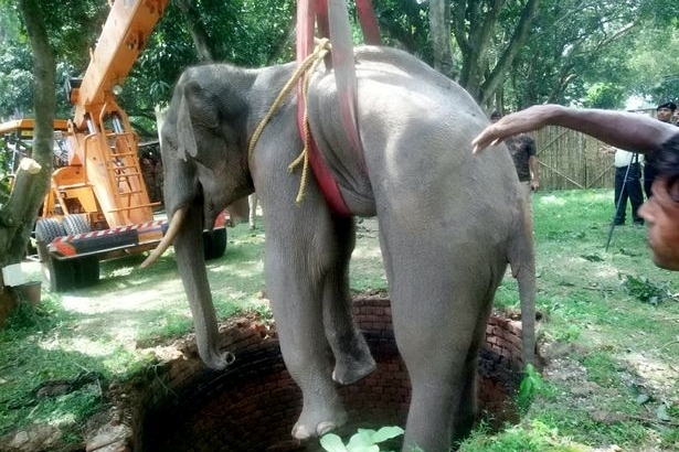 Các binh sĩ tại một doanh trại ở Jalpaiguri, bang Tây Bengal, Ấn Độ đã phát hiện một chú voi kẹt dưới giếng cạn sâu 6m.