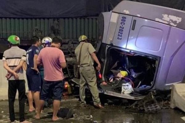 Xe container mất lái, húc đổ dải phân cách khiến cabin rơi ra khỏi xe, nam tài xế mắc kẹt bên trong.