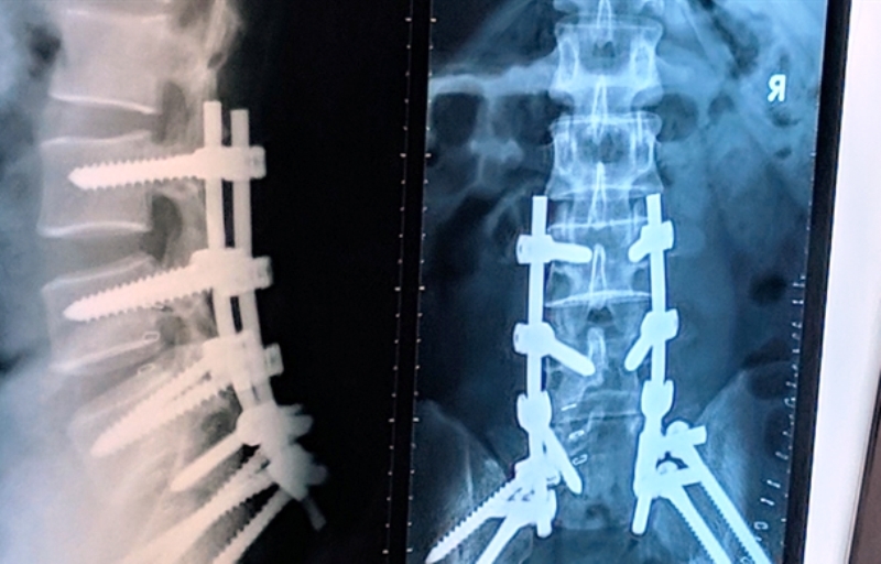 Ảnh chụp X-quang, cột sống bệnh nhân được hỗ trợ bằng dụng cụ nâng đỡ cột sống. Ảnh: Phan Nhơn