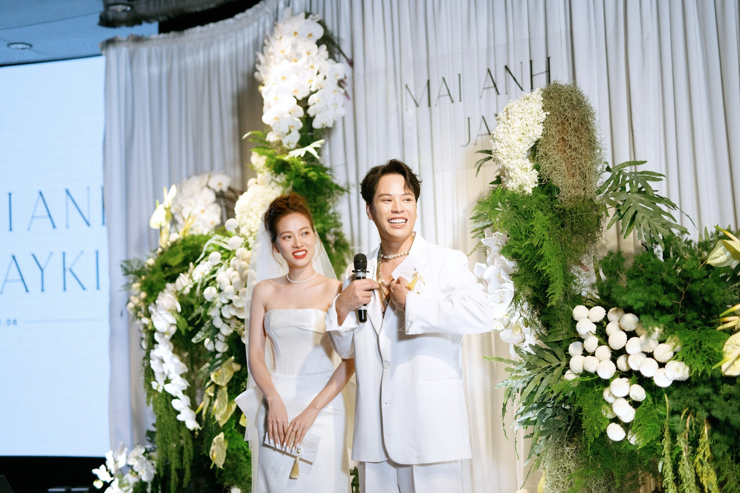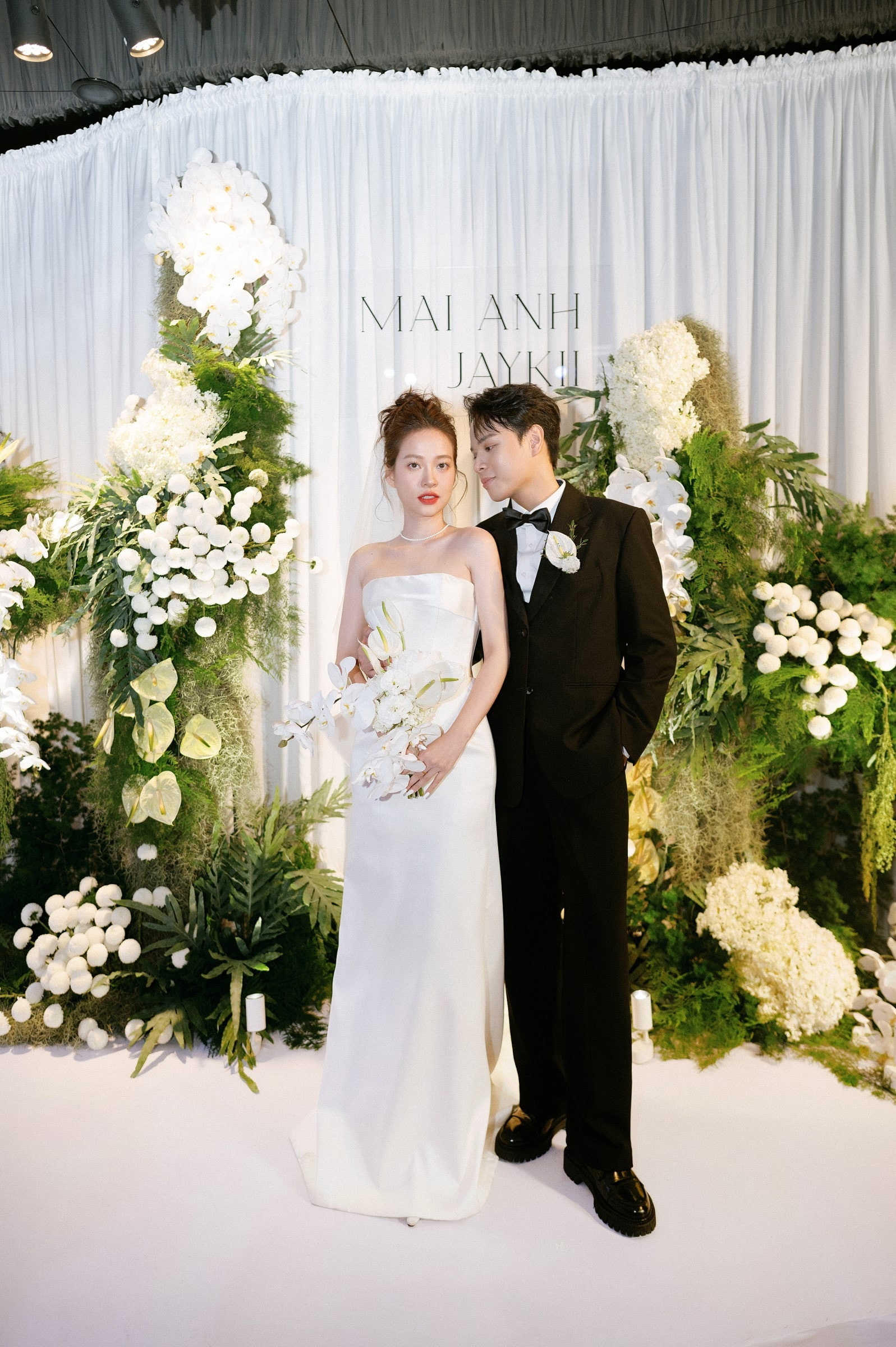 Cô dâu Mai Anh chọn váy cưới trắng tinh khôi, dáng cúp ngực, khoe vai trần gợi cảm. Chú rể JayKii diện vest bảnh bao, lịch lãm trong ngày trọng đại.