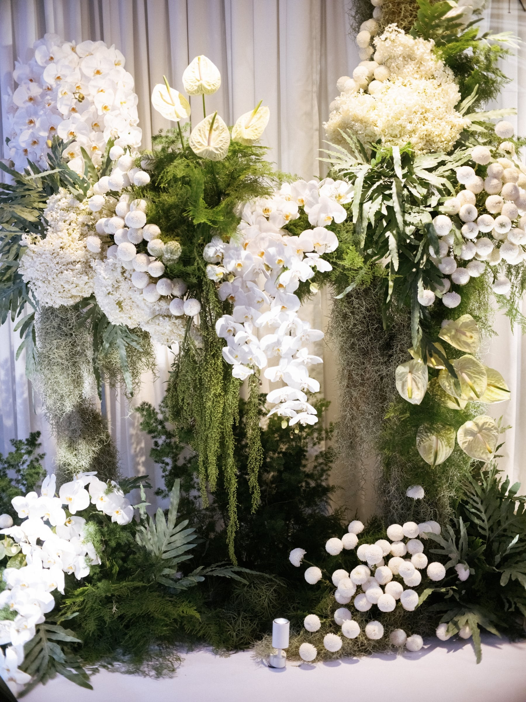 Không gian tiệc cưới trang trí đơn giản, sang trọng với nhiều hoa tươi, sử dụng tông xanh - trắng làm gam màu chủ đạo.