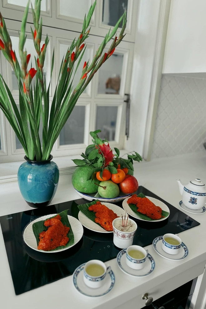 Mai Phương Thúy cho biết dù đã dành trọn buổi sáng để chuẩn bị nhưng vẫn không tránh khỏi một số sai sót. Người đẹp đã sửa soạn mâm cúng với các món như xôi gấc, xôi trắng, chả cốm và các lễ vật khác theo truyền thống.