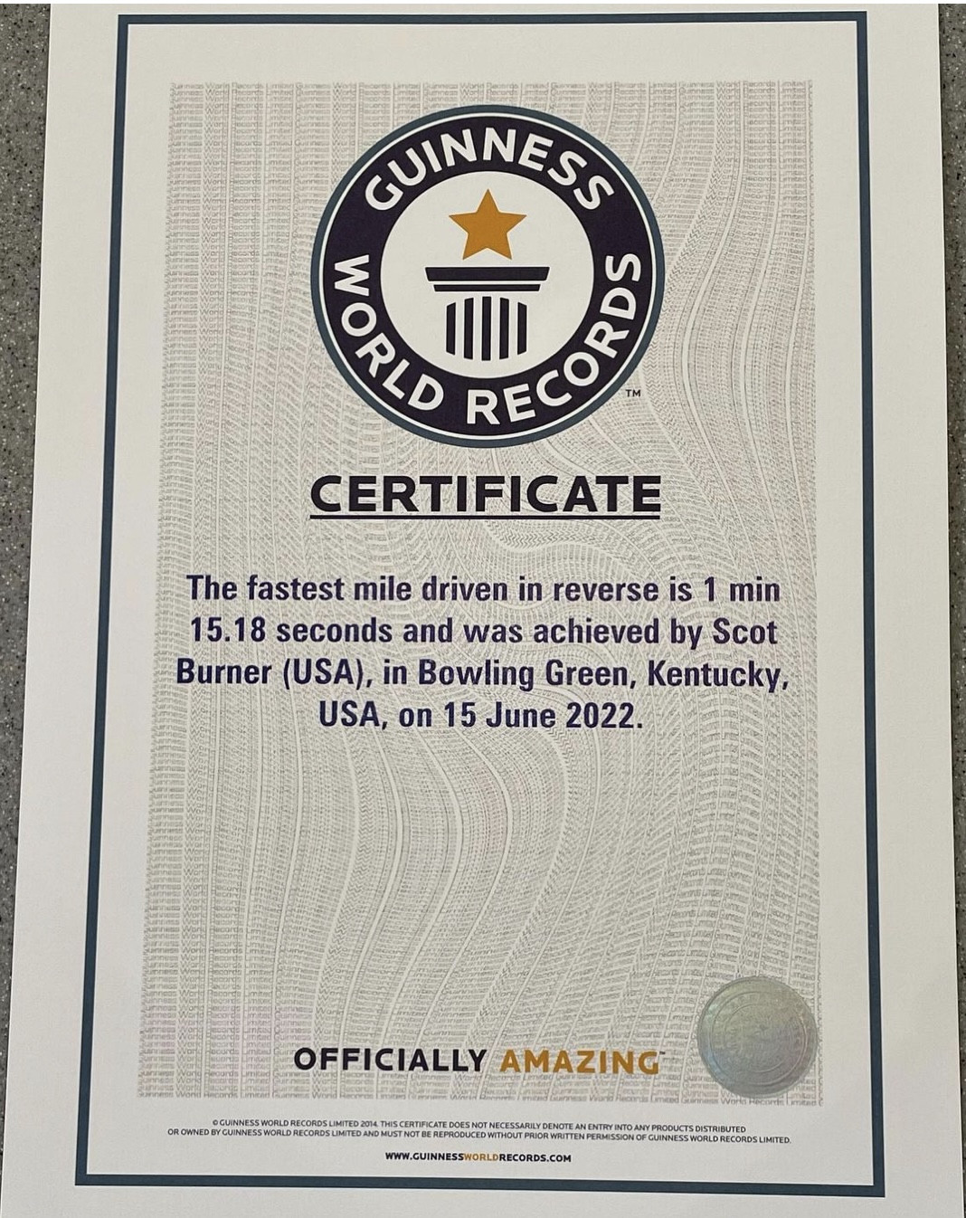 Burner đã thực hiện màn lùi xe phá kỷ lục thế giới Guinness vào ngày 15/6 nhưng mãi tới gần đây mới có được chứng nhận sau khi tổ chức Guinness phân tích video và các dữ liệu thu thập được.