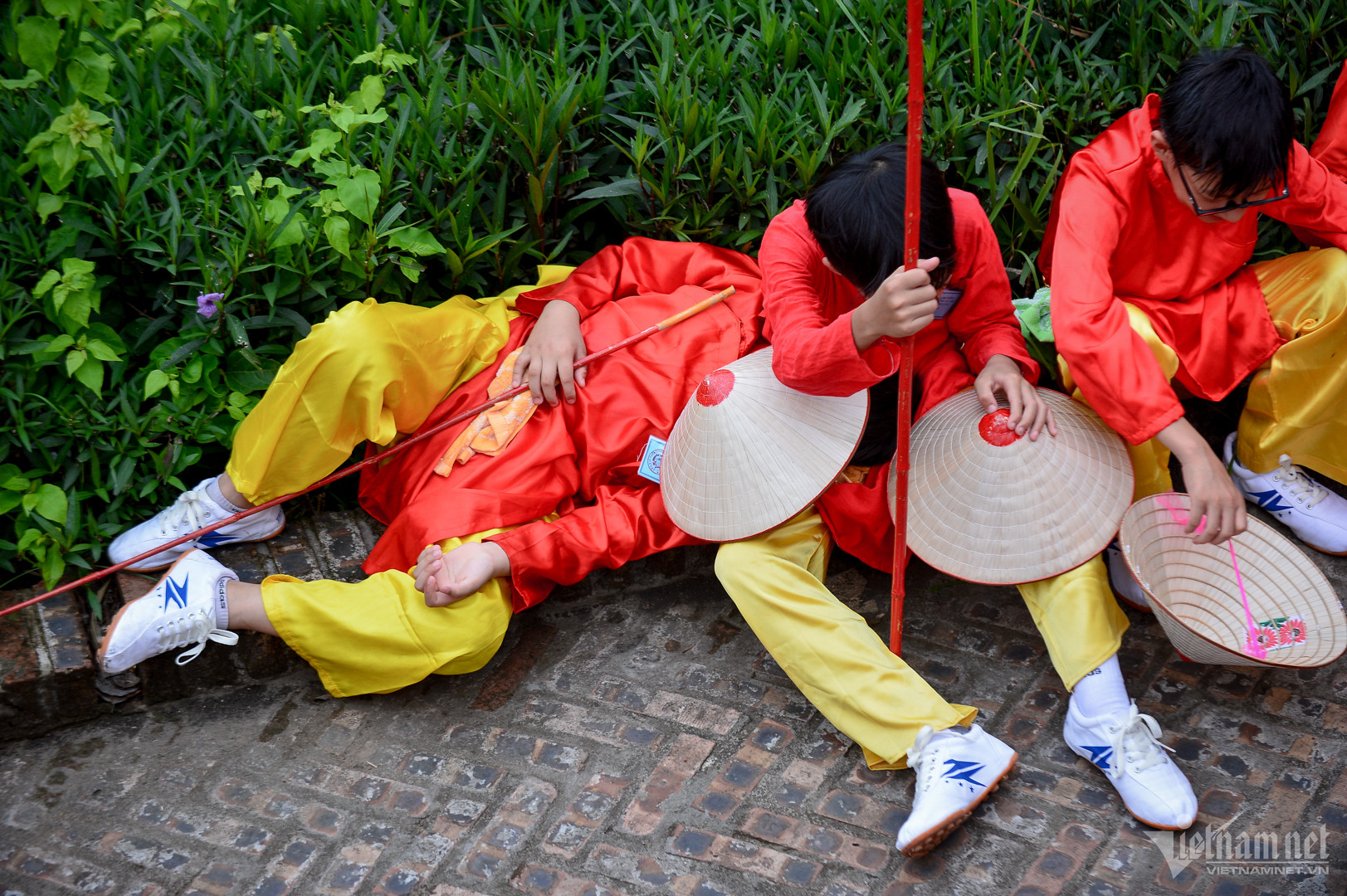 Với quãng đường hơn 3km cùng thời tiết oi bức, nhiều em nhỏ tranh thủ nghỉ ngơi trong khi chờ đoàn rước phía sau.