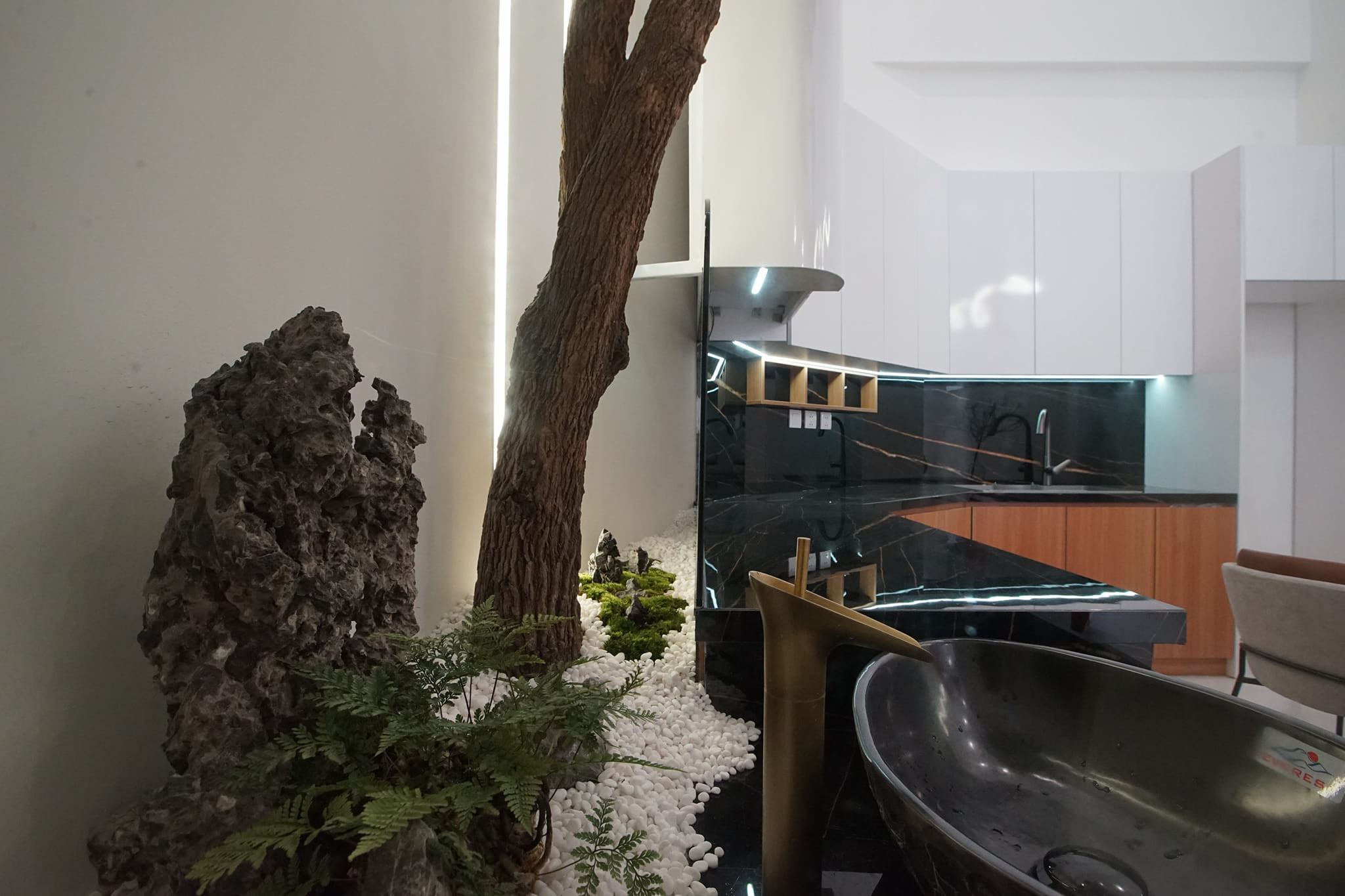 Cạnh vệ sinh chung là một tiểu cảnh đẹp mắt và bồn rửa tay tiện dụng cho gia chủ sử dụng hàng ngày.